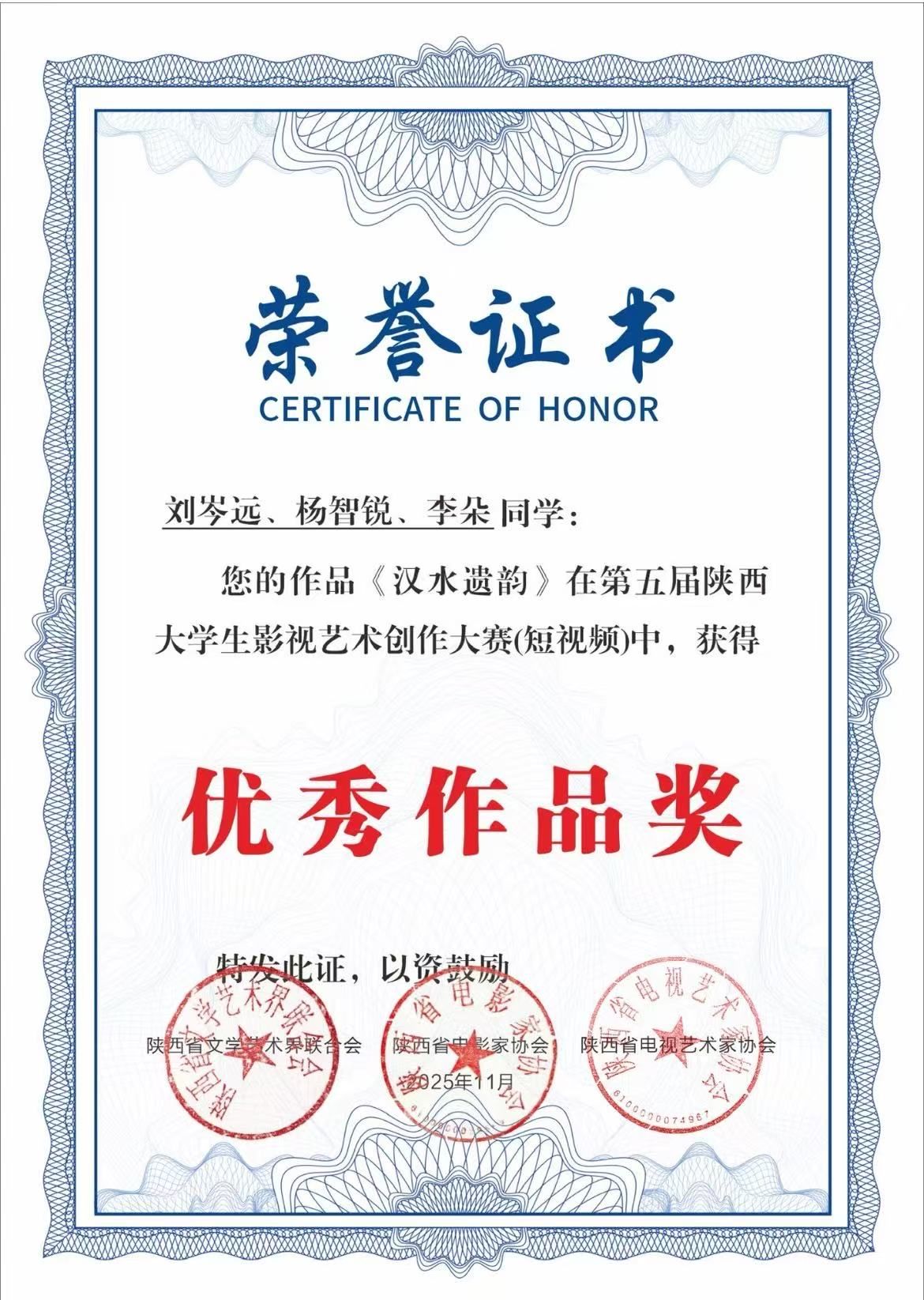 近日,由陕西省文学艺术界联合会、陕西省电影家协会、陕西省电视艺术家协会联合主办的第五届陕西大学生影视艺术创作大赛评选结果正式揭晓,欧冠官网网络与新媒体专业学生刘岑远、杨智锐、李朵在崔瑜老师指导下创作的非遗题材短视频作品《汉水遗韵》荣获优秀作品奖。