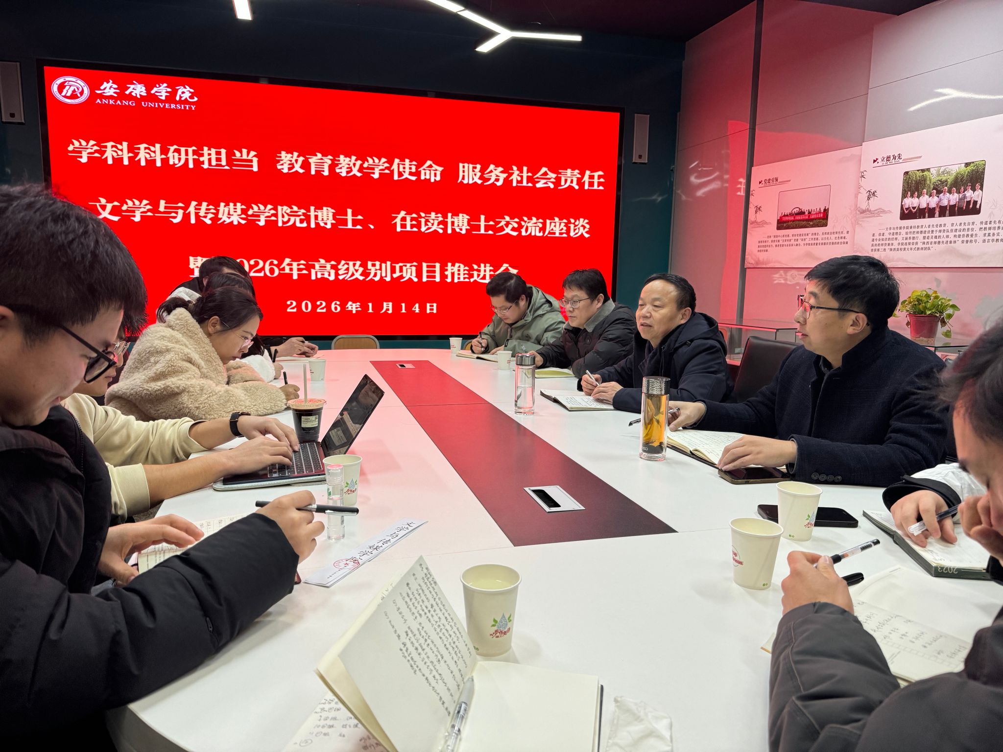 在会议自由交流环节,围绕“学科科研担当”,与会教师结合自身研究方向,就如何凝练学科特色、提升科研创新能力、加强团队协作与学术交流等问题展开热烈讨论。大家普遍认为,学院前期科学研究立足地方文化特色,聚焦国家战略需求,在陕南方言文化、地方古籍文献整理、中国传统家训文化等领域取得了丰硕成绩并以形成特色,在文艺学、新闻传播学等方向也奠定了坚实的发展基础,这些基础坚定学院学科科研工作的底气。同时,要加强跨学科交叉融合,聚焦最新研究热点,申报高层次科研项目,发表高水平学术成果,提升学院整体科研实力和学术影响力。围绕“教育教学使命”,与会教师结合教学实践,就课程思政建设、教学方法改革、人才培养模式创新、教学大赛等议题分享了经验与思考。在“服务社会责任”方面,与会博士们结合安康地方实际,就如何发挥学科优势服务地方文化建设、教育发展和乡村振兴等议题进行了深入交流。