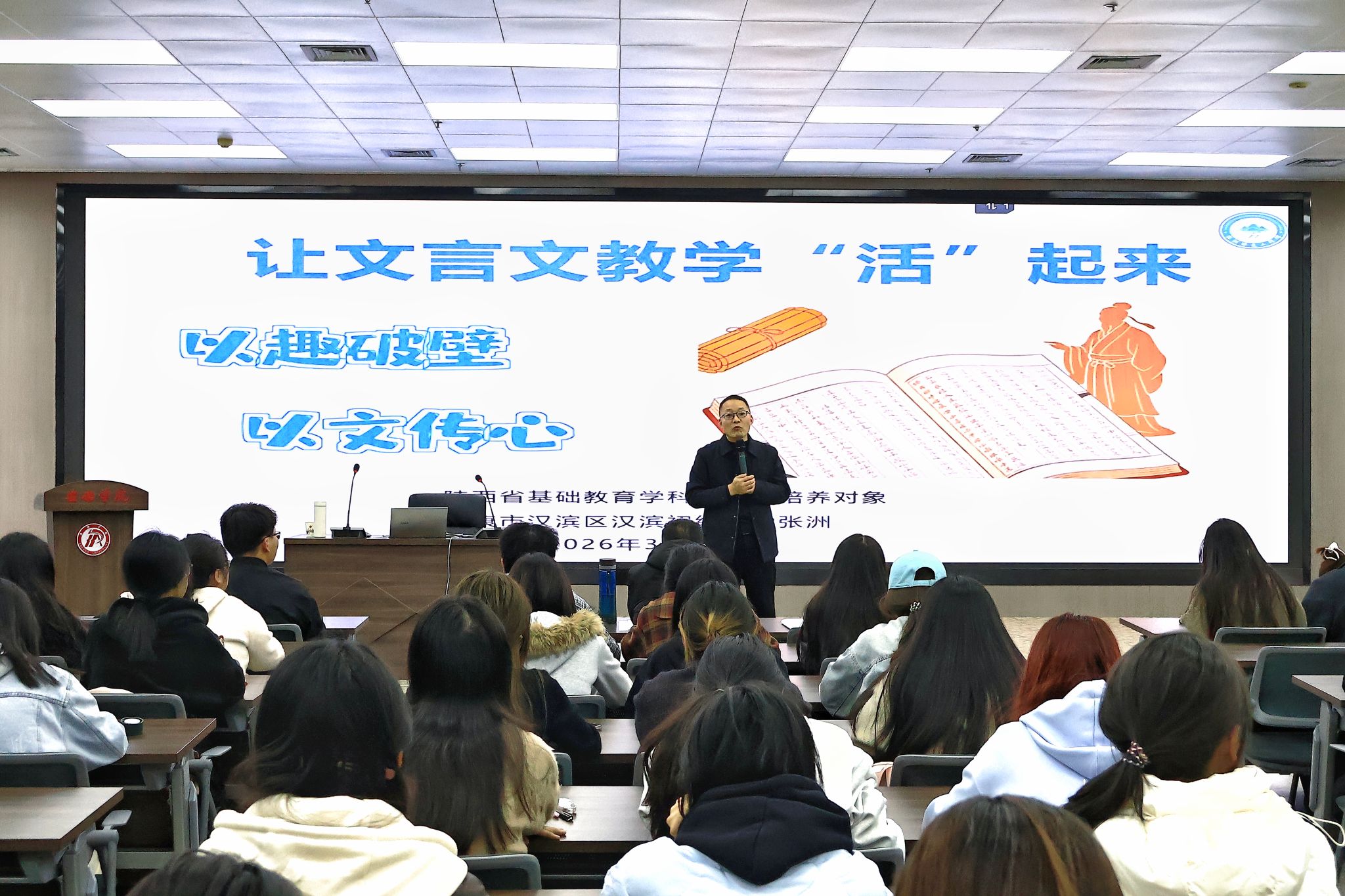 2026年3月11日下午两点半,在图书馆六楼报告厅,欧冠联赛官网特邀陕西省教学能手、汉滨初级中学张洲老师为第六届“中学语文卓越师资班”带来题为《以文传心,以趣启智——文言文教学活起来》的专题讲座。班主任唐明珍老师与全体卓越师资班同学及部分大四学生共同聆听了本场讲座。本次活动由师范技能社承办。