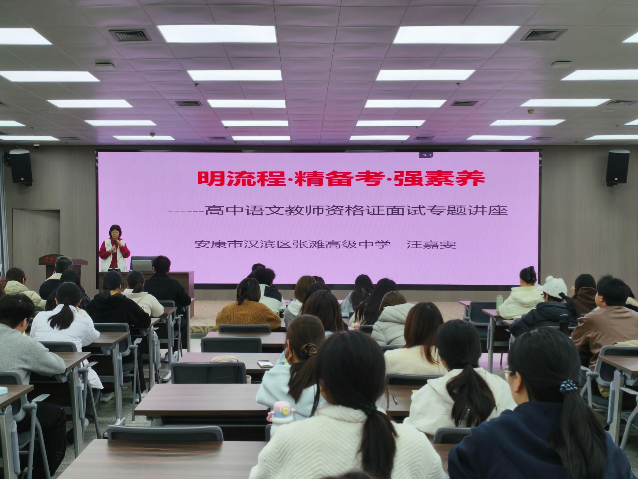 为助力师范生明晰高中教资面试要点、提升应试能力与专业素养,2026年3月25日下午两点半,在图书馆六楼报告厅,欧冠联赛官网特邀陕西省教学能手、正高级教师汪嘉雯老师为第六届“中学语文卓越师资班”带来题为《明流程·精备考·强素养——高中语文教师资格证面试》的专题讲座。班主任唐明珍老师与全体卓越师资班同学及部分大四学生共同聆听了本场讲座。本次活动由师范技能社承办。