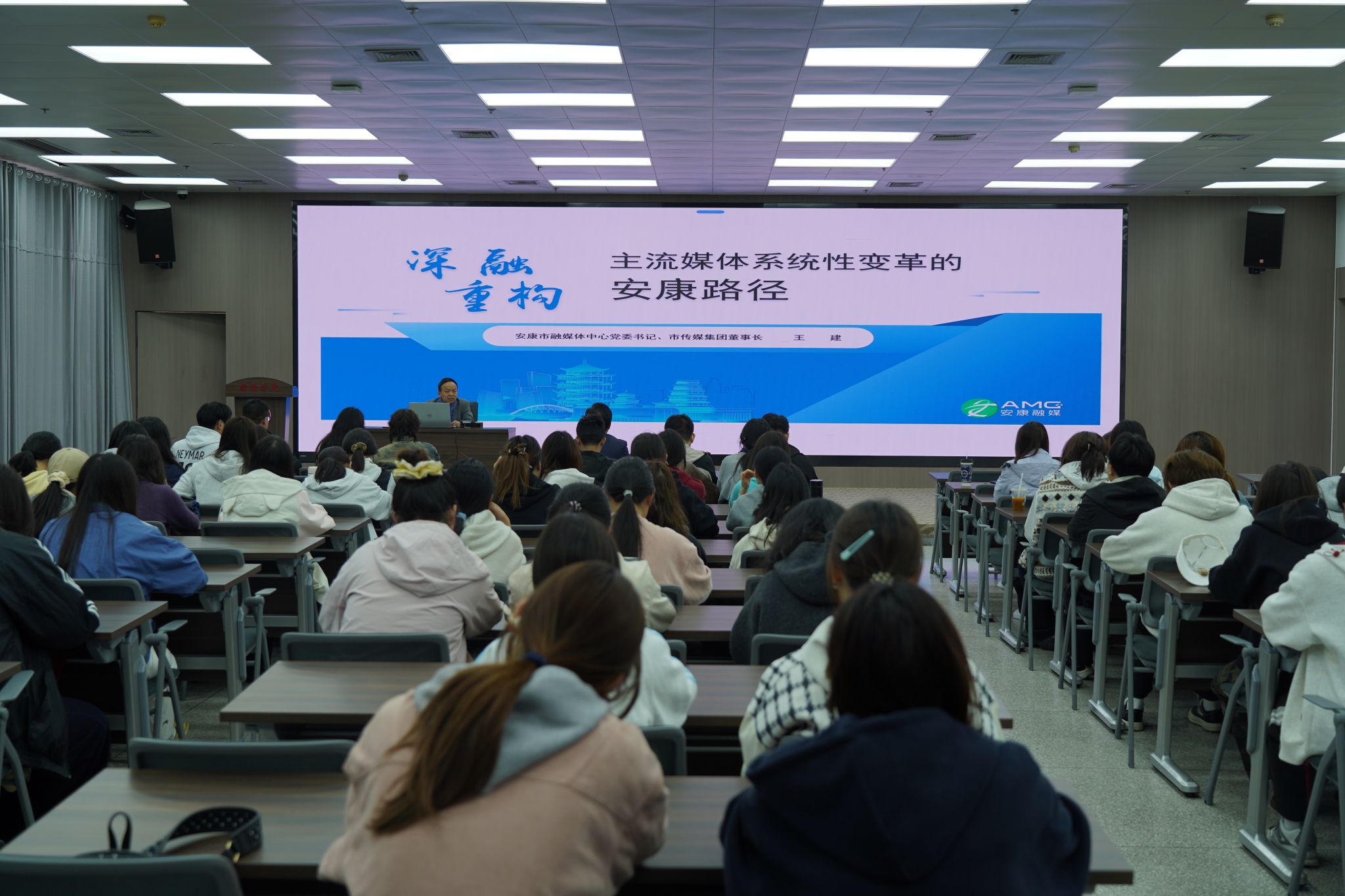 讲座中,王建围绕数智化浪潮下主流媒体的系统性变革,将时代趋势与安康本土实践深度融合、层层递进,系统阐释了主流媒体变革的时代逻辑与实践路径。他结合数智化浪潮对传媒格局与舆论生态的颠覆性重塑,从深刻把握数智时代媒体“强身补钙”的重要性与紧迫性、新闻传播及传播教育面临的现实冲击、数字化智能化对传媒格局和舆论生态的重塑、跨界融合趋同与技术迭代加速下资讯功能泛化四个方面,深入解读了主流媒体推进系统性变革的时代价值与现实意义。