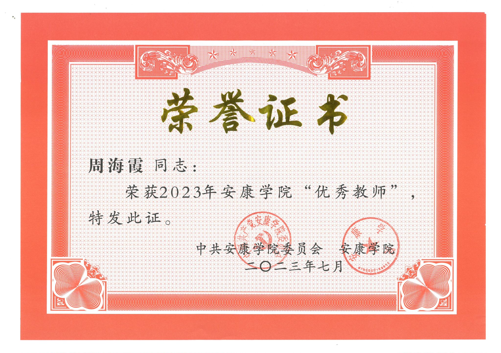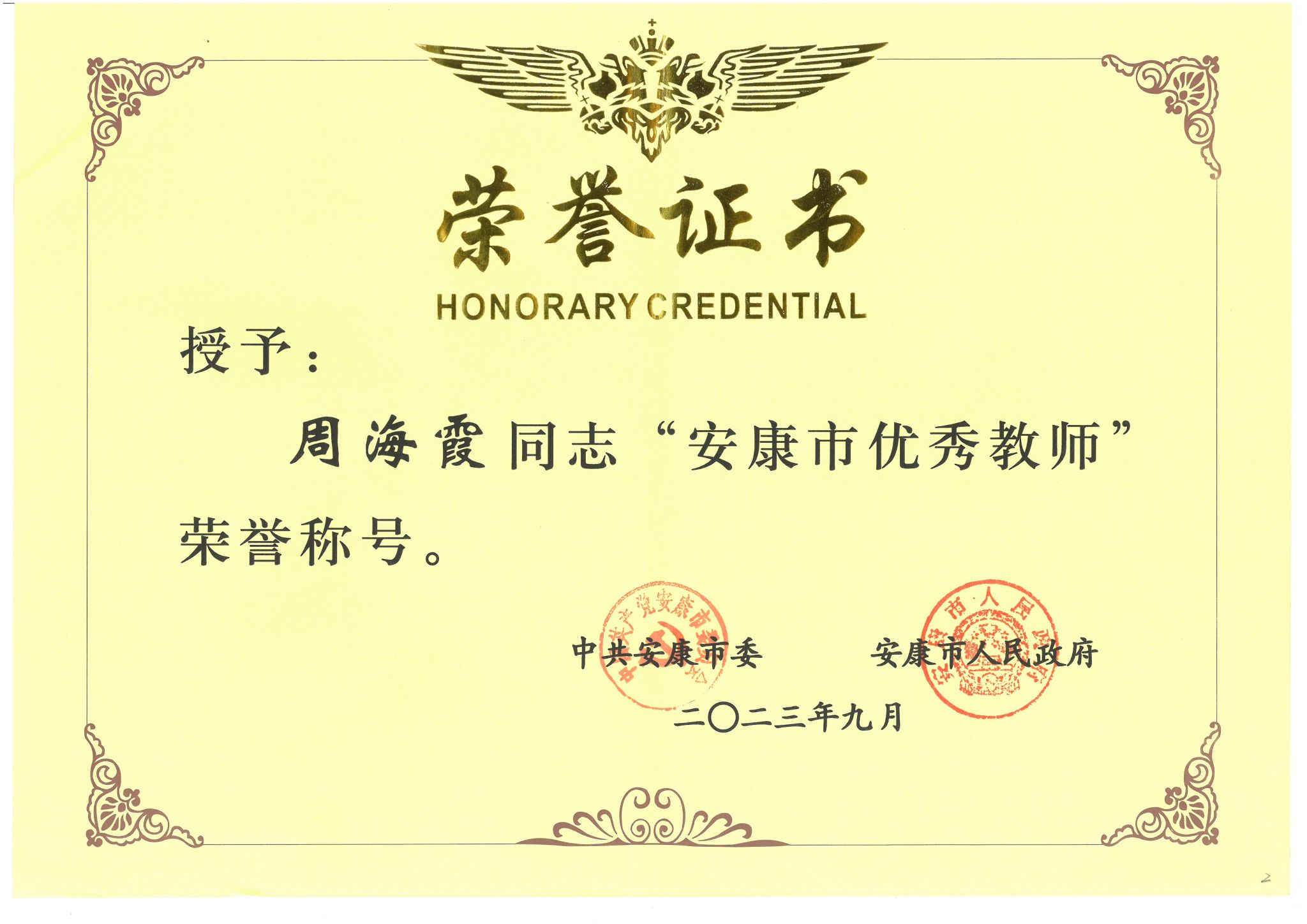 根据《关于推荐评选安康市教育工作先进集体和优秀教师、师德标兵、优秀班主任、先进教育工作者的通知》(安评组办发〔2023〕5号)精神和《欧冠联赛官网关于开展2023年校级教职工荣誉评选工作的通知》(党政办发〔2023〕16 号)相关要求,经个人申报、学校组织专家评审,欧冠官网教师周海霞被评为欧冠联赛官网优秀教师,同时被推荐参评安康市优秀教师,经安康市评审,确定周海霞为2023年安康市优秀教师。
