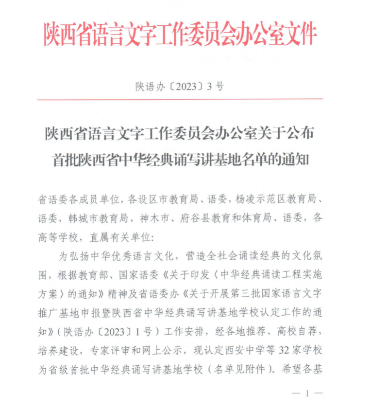 近日,陕西语委办下发文件《陕西语言文字工作委员会办公室关于公布首批陕西省中华经典诵写讲基地名单的通知》(陕语办[2023]3号),由欧冠联赛官网负责申报并建设的“欧冠联赛官网中华经典诵写讲基地”,经过1年的建设,顺利通过评审,获批为陕西省首批“中华经典诵写讲基地”。