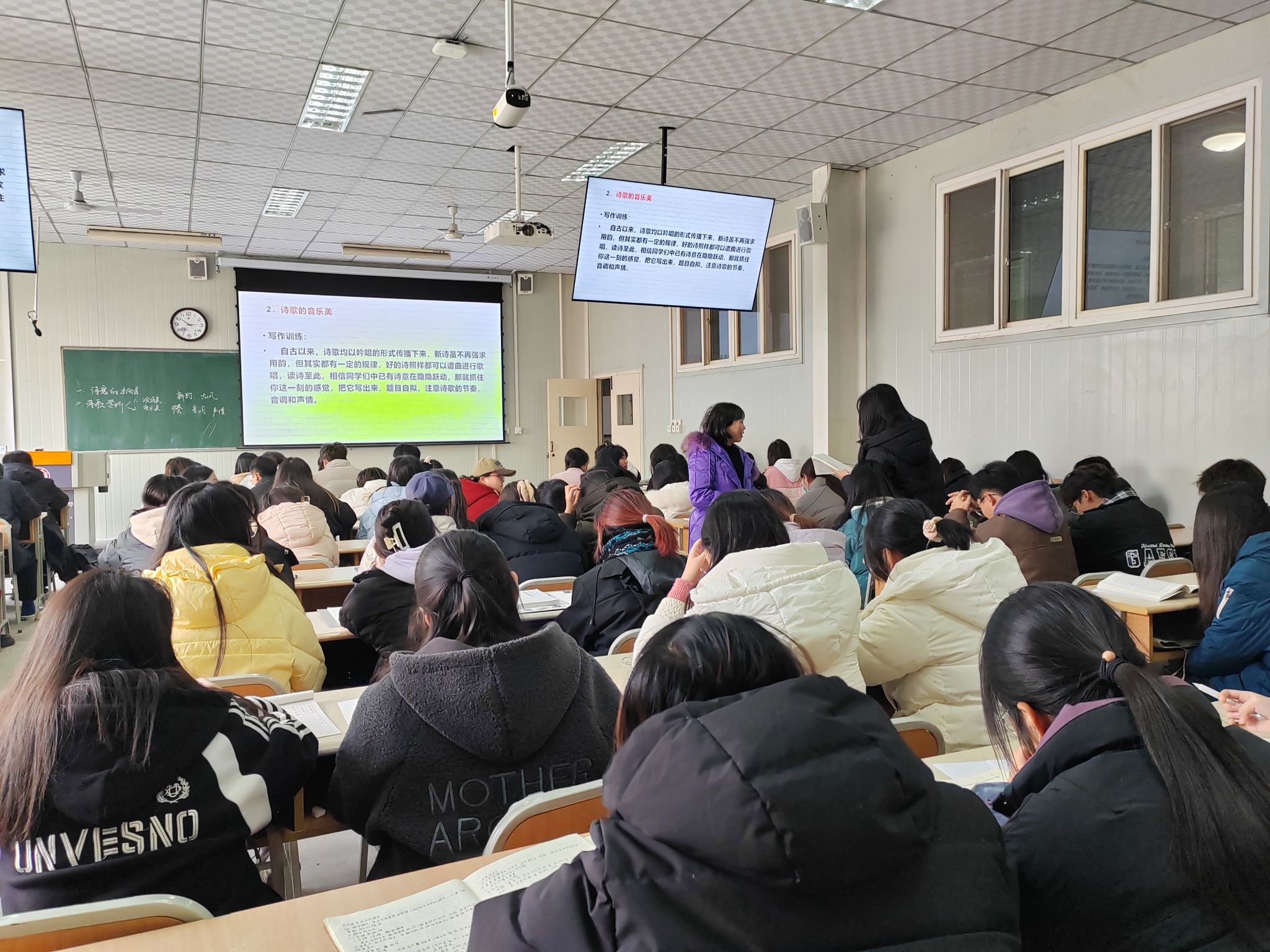 12月22日下午,作家李爱霞应欧冠联赛官网邀请,在江南校区1026与《基础写作》课校内教师韩文霞一同为汉语言文学专业学生讲授诗歌的写作。