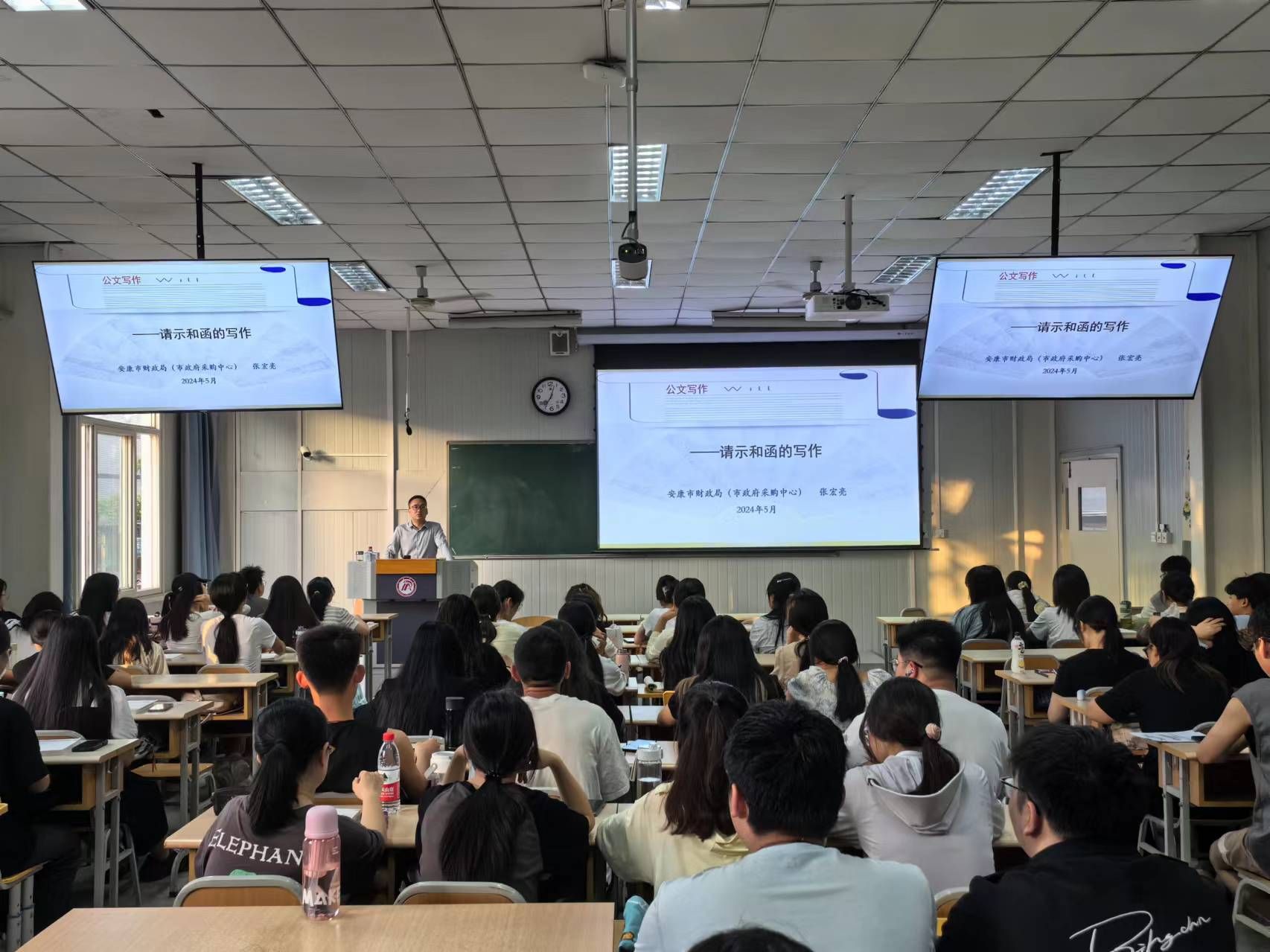 按照应用文写作“双师课程”教学计划,欧冠联赛官网分别5月21日、286月4日、11日、14日邀请课程安康市政府采购中心张宏亮为汉语言文学20231、2班学生讲授请示、批复、报告、函、纪要等公文和申论写作的技巧。校内任课教师胡少山随堂参与了授课。