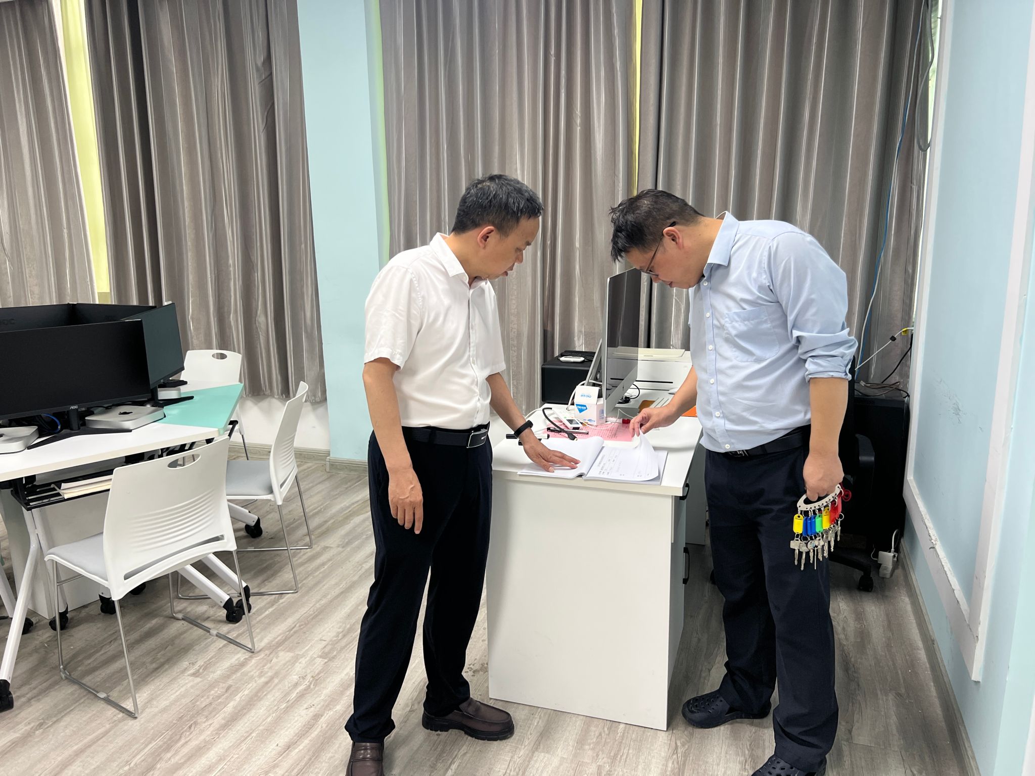 6月30日,欧冠联赛官网院长杨运庚、副院长朱云率党政办主任崔瑜、实验室主任张建涛组成专项检查组,对学院秘书实训室、创意写作实训中心、虚拟演播室等教学实践场所开展本学期末安全专项检查,重点围绕门窗安防、电气安全等领域深入排查隐患,全力保障暑假期间实验室及教学设备的安全运行。