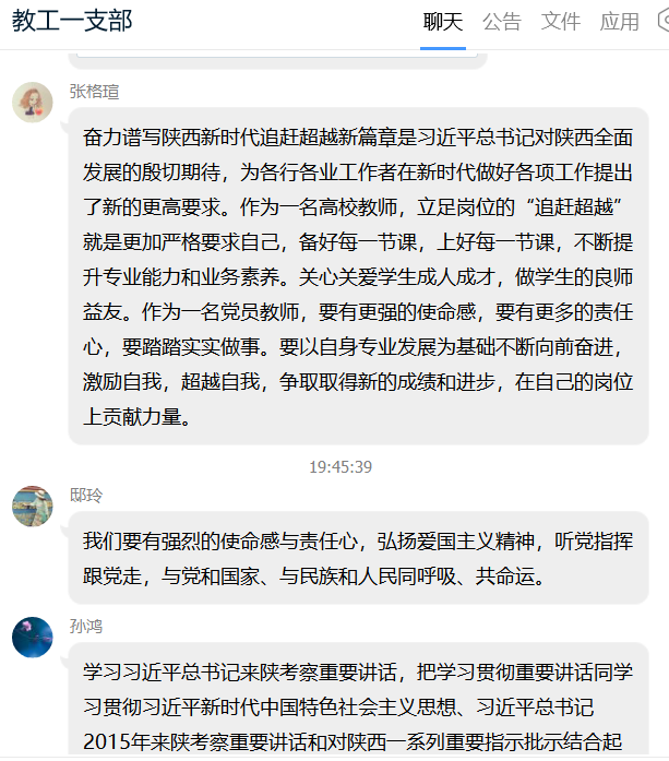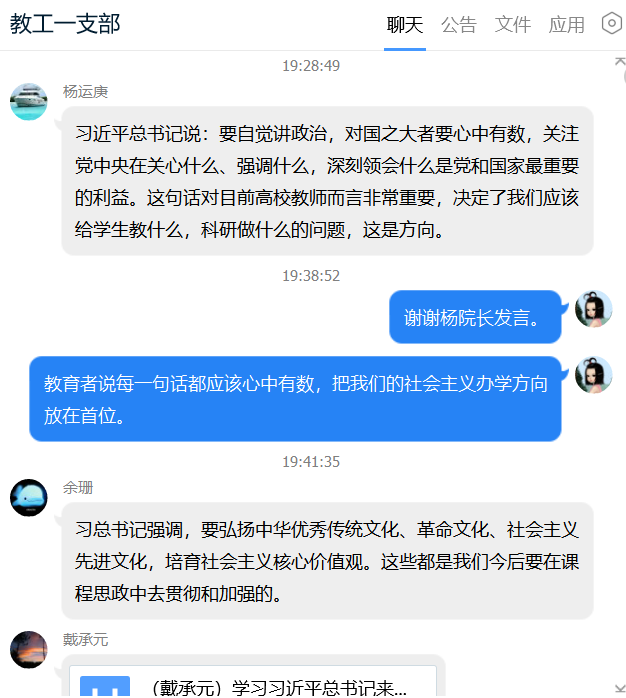 随后,党员们结合学习内容分享了对于党员大局意识、历史意识、角色意识的认识,对“西迁精神”“延安精神”的理解,对教师职业道德、课程思政、教师教学科研方向等问题的思考,也表明了只争朝夕、真抓实干,为坚持社会主义办学方向、做好高校好老师而努力的决心。