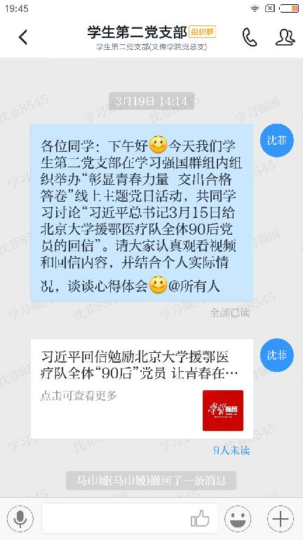 2020年3月19日下午14:30,欧冠联赛官网学生第二党支部通过“学习强国”平台,组织全体党员集中学习了习近平总书记的回信内容。全体党员倍感振奋和鼓舞,并结合自身实际情况进行了热烈讨论。
