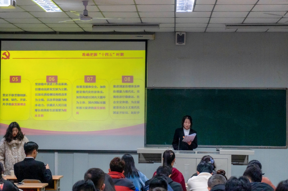 党的十九届五中全会擘画了我国未来发展的宏伟蓝图,作出了应对变局、开辟新局的顶层设计,在党和国家发展进程中具有全局性、历史性意义。宏伟蓝图鼓舞人心,学习宣讲凝聚力量。为全面落实党的第十九届五中全会精神,由学工部、马克思主义学院主办,欧冠联赛官网协办的十九届五中全会宣讲活动于12月23日在江南校区10号教学楼1012室举办。欧冠联赛官网党支部副书记杨海蓉、欧冠联赛官网学生宣讲团成员、欧冠联赛官网全体团学干部参加本次宣讲活动。活动由杨海蓉主持。