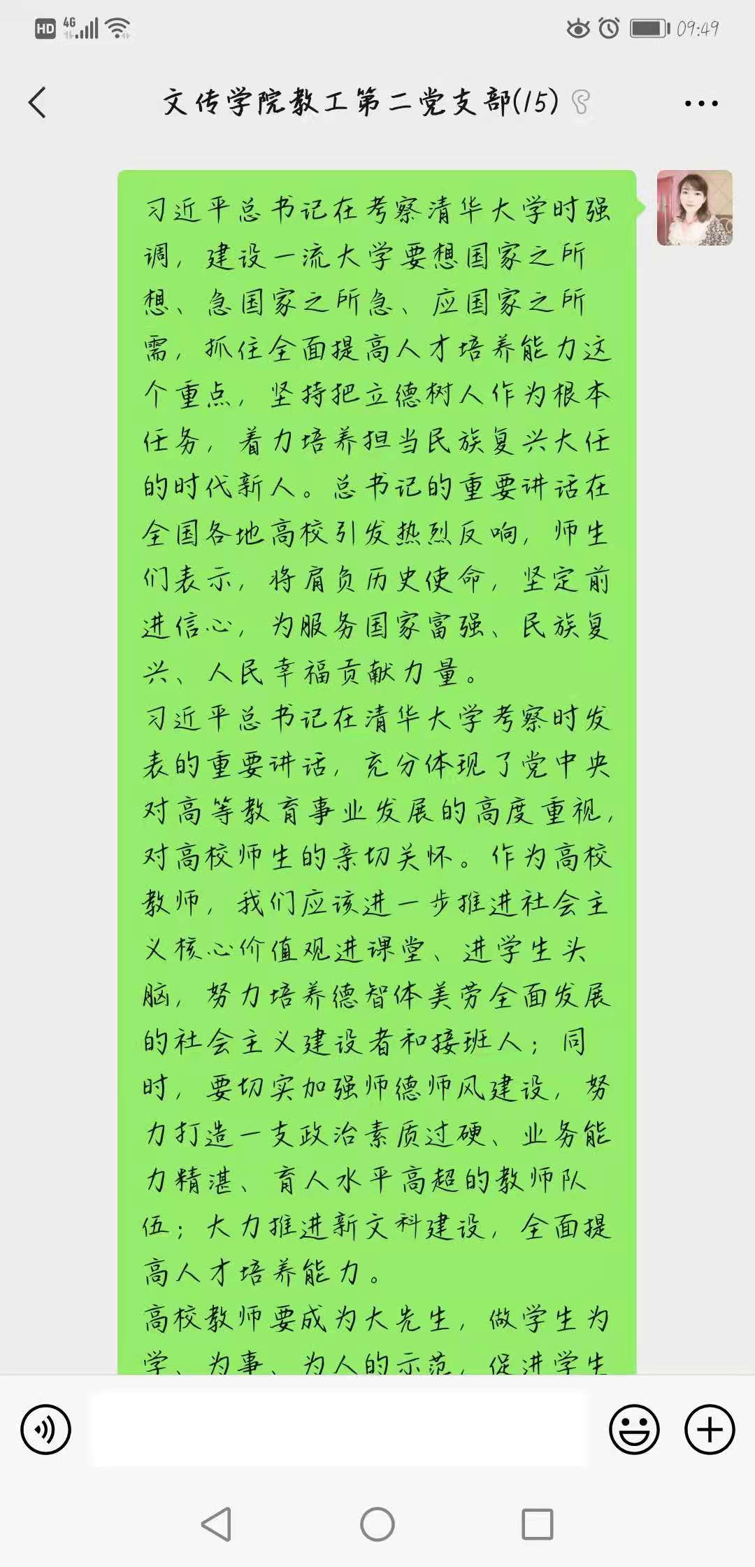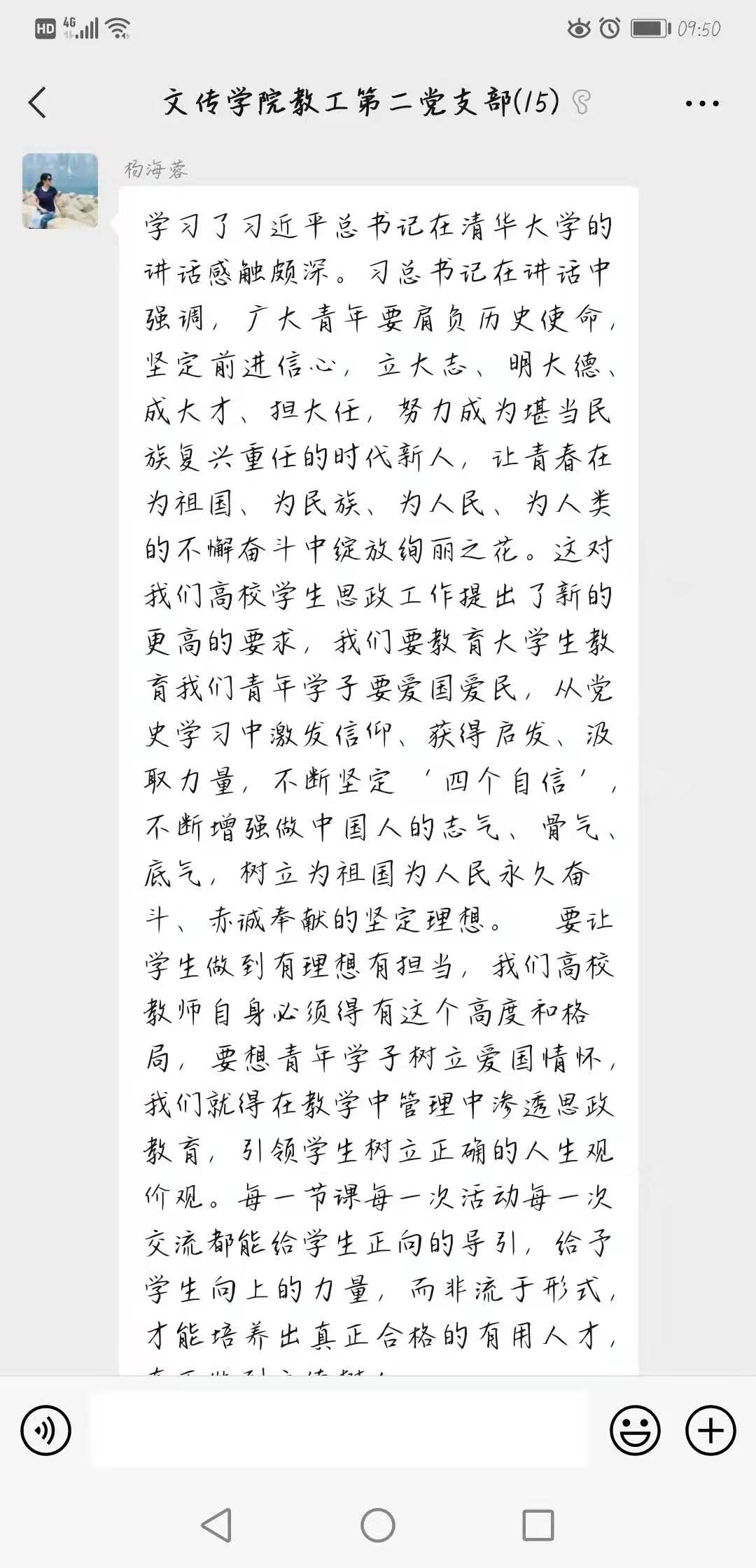 支部同志一致认为,深入学习贯彻习近平总书记重要讲话精神,对于切实落实立德树人根本任务,着力培养德智体美劳全面发展的社会主义建设者和接班人,具有十分重要的意义。作为新时代的高校教师,应努力成为总书记讲话中的“大先生”,做学生为学、为事、为人的示范。