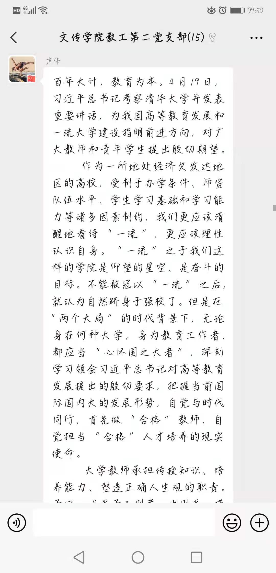 院党总支书记芦伟认为,教育工作者应“心怀国之大者”,深刻学习领会习近平总书记对高等教育发展提出的殷切要求,把握当前国际国内大的发展形势,自觉与时代同行,做“合格”教师,自觉担当“合格”人才培养的现实使命。著名作家李春平认为,通过学习讲话,我们可以结合实际来研究有关地方服务,地方文化建设以及学科建设等问题,不断推动学校与学院的未来发展。支部组织委员崔瑜认为在工作中要主动关心学生的思想状况、学业成长,帮助学生解决困惑、难题,在坚定立德树人的职业理想中彰显为师者的尊严和价值,真正做到以学生为中心,想学生之所想、急学生之所急。最后,支部宣传委员盘珊君作了活动总结。