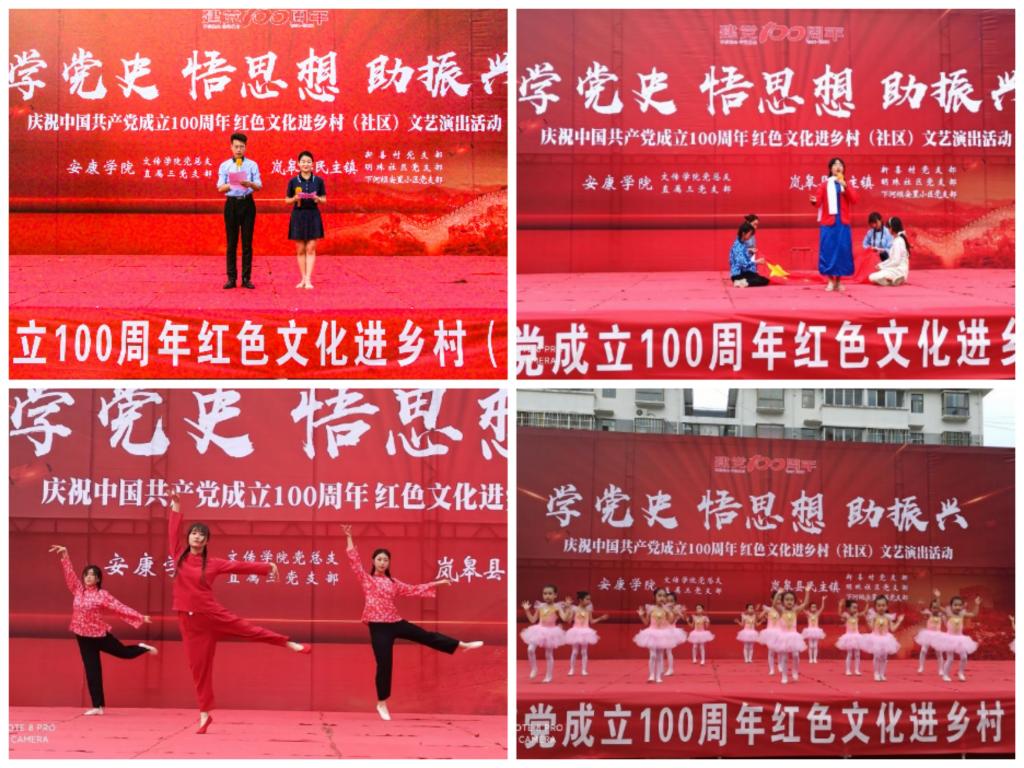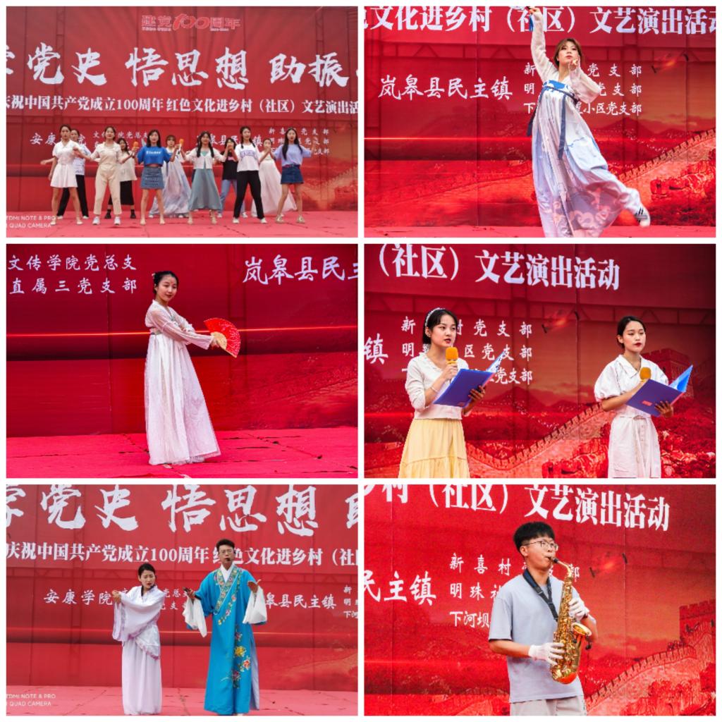 为扎实推进党史学习教育走深走实,6月1日下午,欧冠联赛官网党总支与直属三党支部把党史学习教育与助力乡村振兴相结合,进一步发挥社团活动优势,传承革命精神,带领支部10余名党员和学生文艺演出团队前往学校帮扶的岚皋县民主镇新喜村,开展了庆祝建党百年“学党史 悟思想 助振兴”红色文化进乡村文艺演出活动。