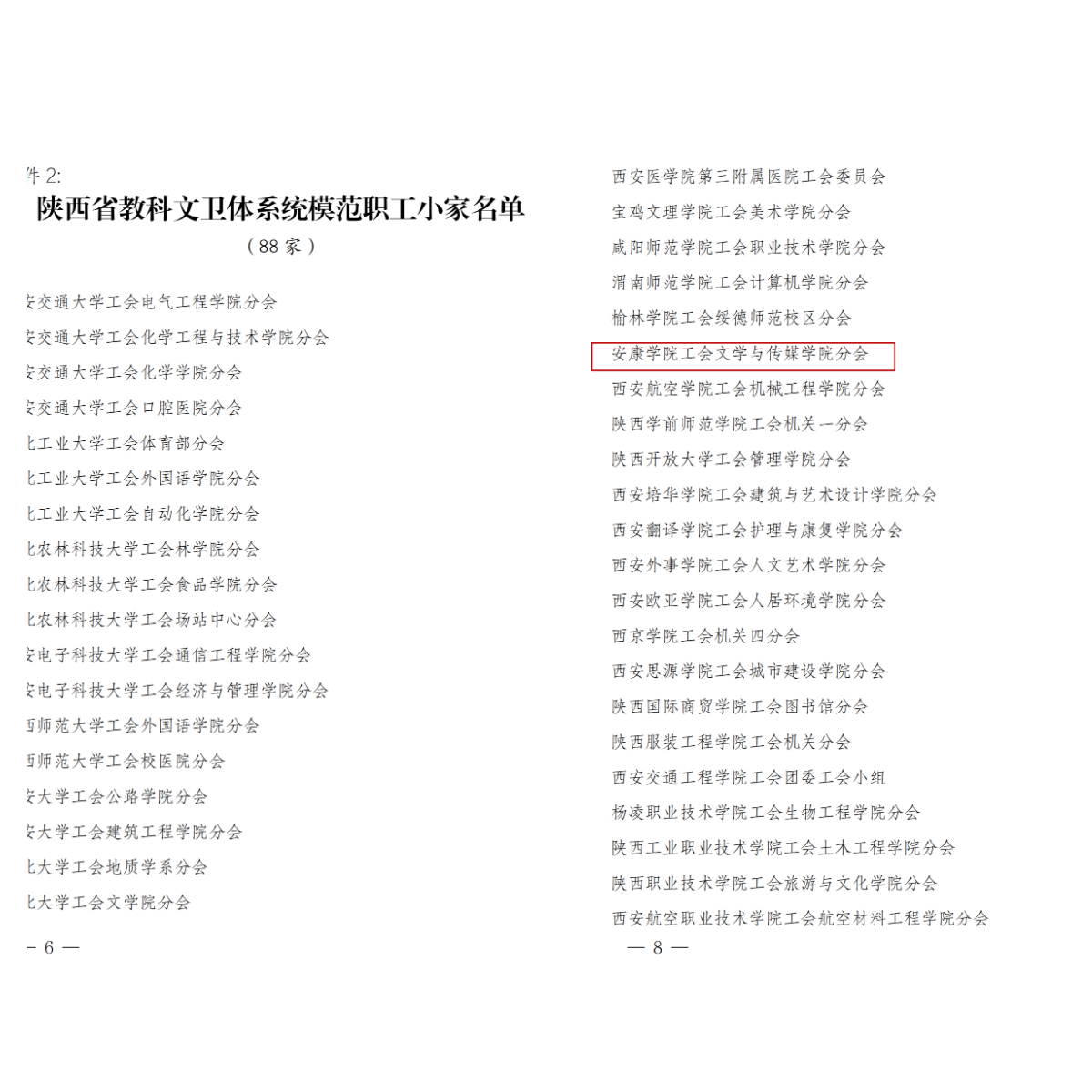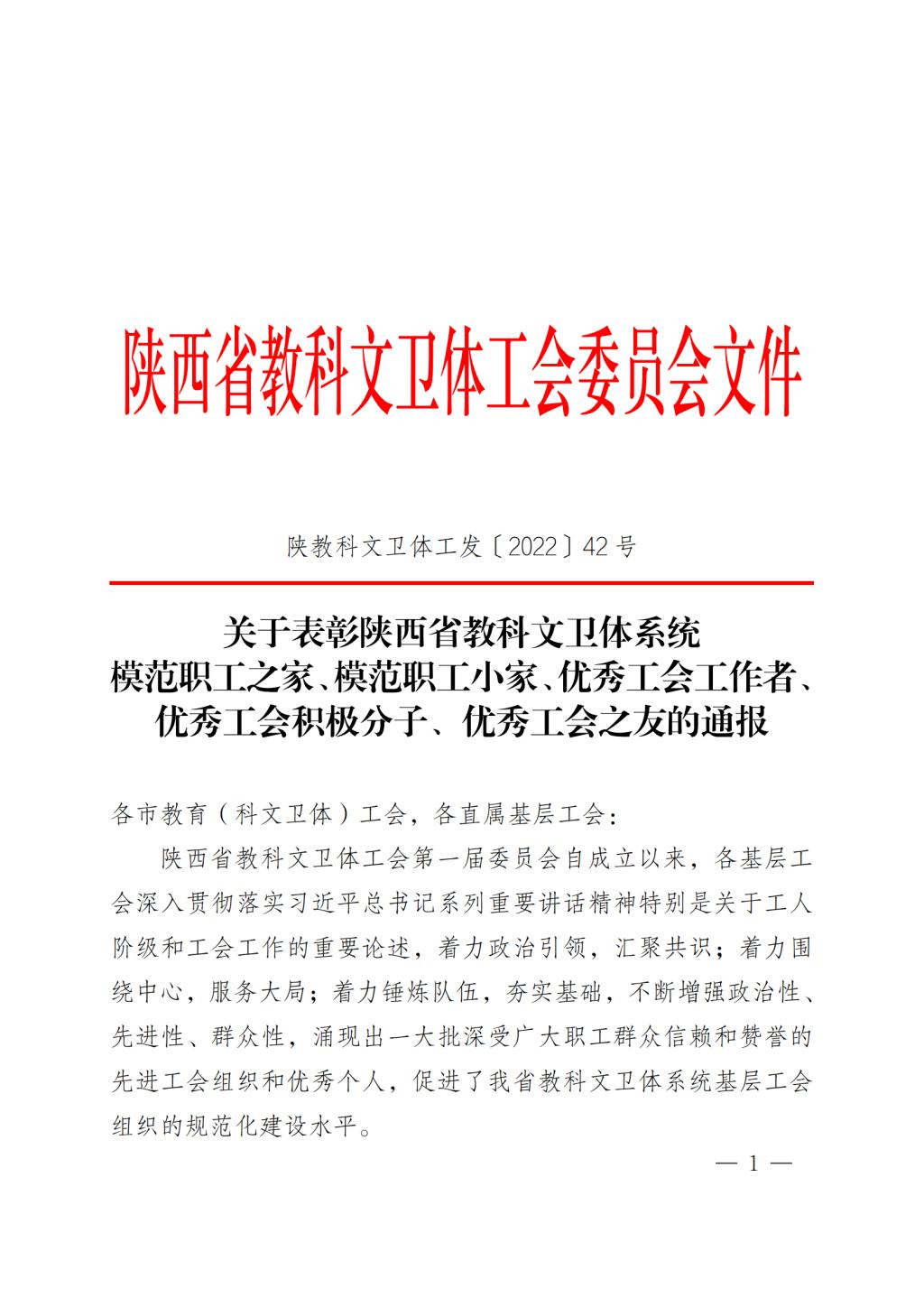 近日,陕西省教科文卫体工会委员会印发《关于表彰陕西省教科文卫体系统模范职工之家、模范职工小家、优秀工会工作者、优秀工会积极分子、优秀工会之友的通报》,工会欧冠联赛官网分会被授予陕西省教科文卫体系统模范职工小家称号。