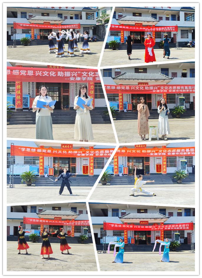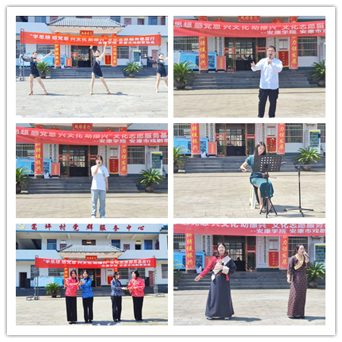教职工一行首先前往蒿坪镇蒿坪村党群服务中心,由邹棠华老师带领的影视戏剧社学生文艺演出团队给当地村民们献上了一场主题为“学思想 感党恩 兴文化 助振兴”文化志愿服务基层行的文艺演出,演出中,二胡独奏、拉丁舞蹈、合唱、独唱等表演形式多样,节目精彩纷呈,赢得了现场观众的频频喝彩。
