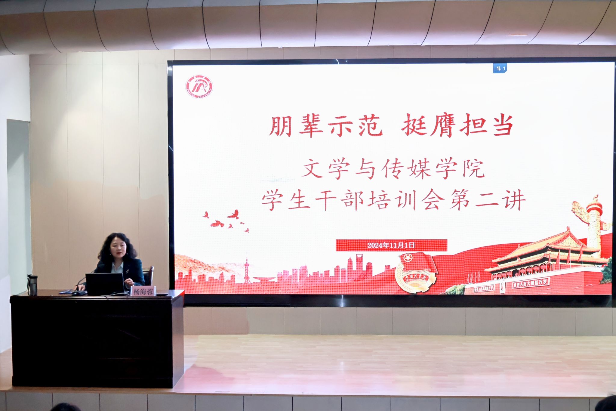 杨海蓉围绕学生干部的基本礼仪、基本素质、基本意识、基本能力、人际交往五个方面内容,强调了学生干部在日常工作中的行为规范。她希望学生干部以身作则,规范言行举止,在生活工作学习中切实起到正向示范作用。学生干部要做到先人后己,保持公心公正,具备良好的心理和身体素质,能应对挑战和压力。她激励学生干部以更高的标准要求自己,自律自强,努力提升交际表达能力、组织管理能力、创新决策能力和危机处理能力,并通过生动事例,阐释如何在实际工作中提升综合能力,如何处理好与老师、同学之间的关系,协调好工作与学习,涵养格局,行稳致远。