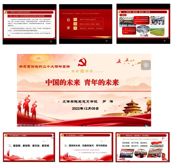 为促进青年学子学习贯彻党的二十大精神,进一步深刻领会习近平新时代中国特色社会主义思想,加强青年学生的培养、凝聚青年学生力量,引导青年担当时代责任。129日晚,学院党总支书记芦伟以“中国的未来 青年的未来”为题,为2022级学生宣讲党的二十大精神暨新生入学教育第六讲。本次宣讲会通过腾讯会议召开,会议由辅导员李欣逸主持。