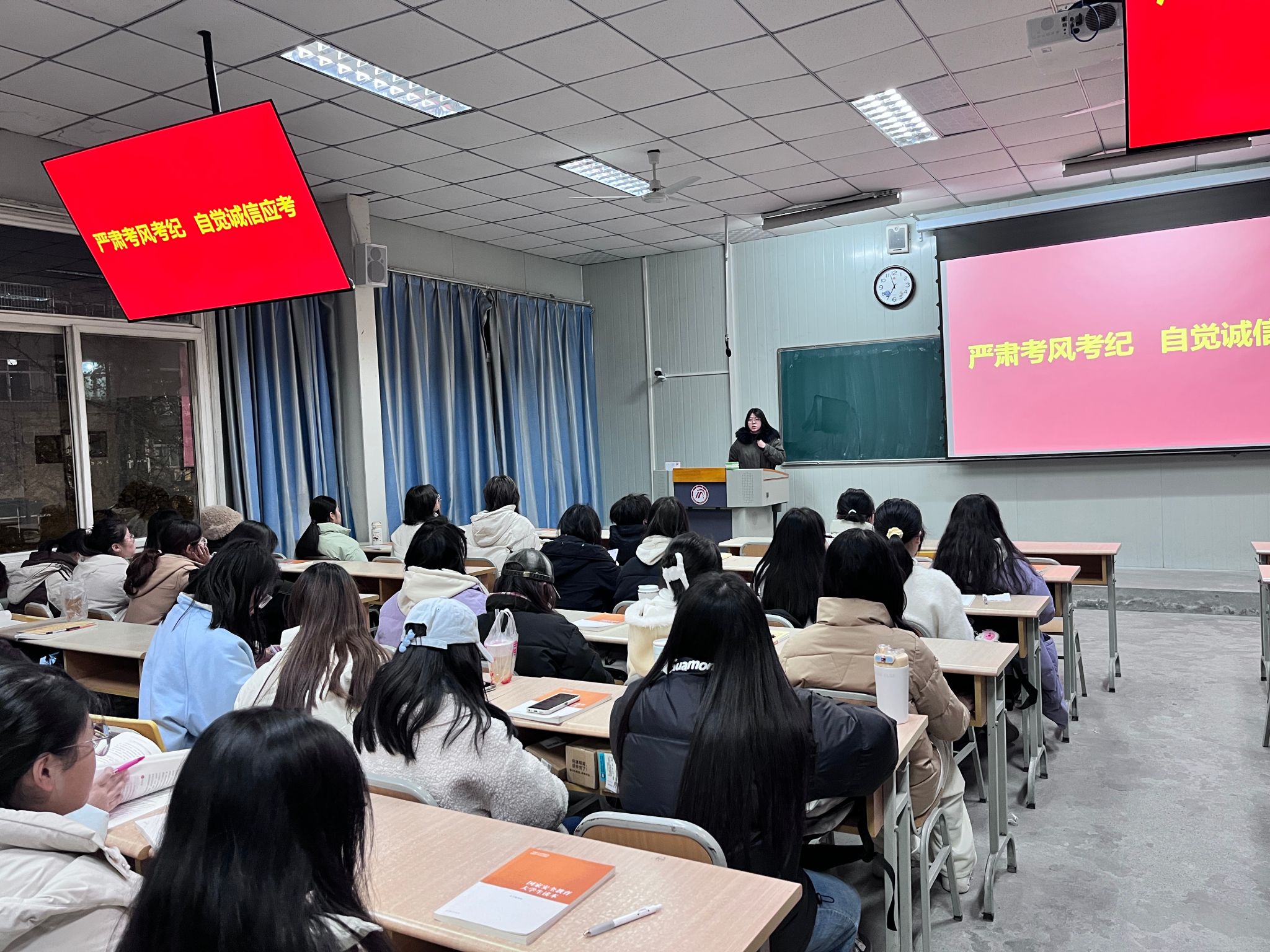 辅导员老师向同学们详细阐释了学校的考试纪律和相关规章制度。通过解读《学生手册》管理规定,以及展示因考试作弊而受到严肃处理的典型案例,让同学们深刻认识到考试作弊行为的严重性和不可容忍性,考试作弊不仅违背了基本的学术道德规范,更是对自身学业和未来发展的严重损害。