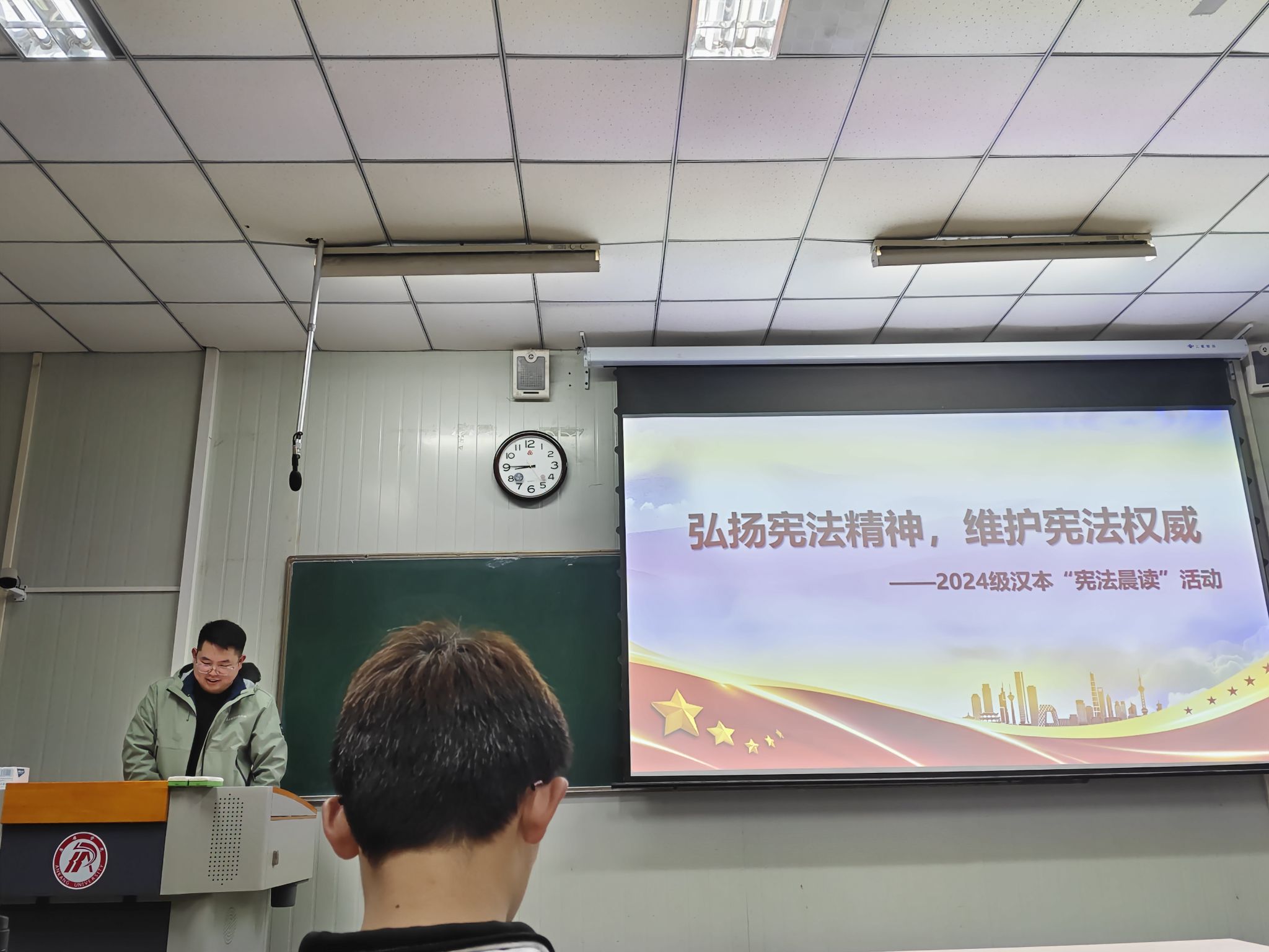 各年级辅导员向同学们普及宪法作为国家根本大法,与每个公民息息相关。各班在班干部的带领下,全体同学庄重而严肃地诵读《中华人民共和国宪法》部分章节,同学们在诵读过程中深刻感受宪法的庄严与神圣。诵读后,同学们分享自己的学习感悟,通过诵读对宪法赋予公民的权利和义务有了更加清晰的认识,明白了在日常生活中要自觉遵守宪法,依法行使权利,积极履行义务。同学通过学习也深刻意识到宪法是维护社会公平正义的基石,作为新时代的青年学生,要积极传播宪法知识,弘扬宪法精神,为建设法治社会贡献自己的力量。