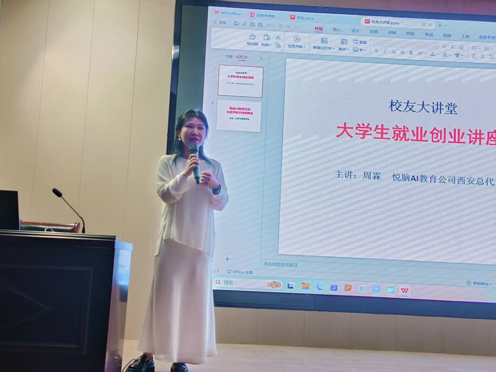 周霖校友以“青春和理想”为主题,结合自身经历展开分享。她回顾了自己的职业成长历程:从大学时期因就业压力陷入焦虑,到毕业后各行业间的不断尝试,最终实现创业梦想。她以创业过程中团队建设、资源整合、市场定位等实际案例,为在场学生提供具体建议:“创业不仅需要专业能力,更要学会在不确定性中寻找确定性。职业选择不是一蹴而就的,而是在持续实践中找到适合自己的方向。”周霖结合自身经历,建议大家:“兴趣是最好的导师,但职业发展需要将兴趣转化为可落地的技能。无论是考研深造还是直接就业,都要提前做好市场调研与个人定位。”她还特别提醒毕业生:“职业初期不必过分在意薪资高低,而应关注平台对能力的锻炼价值,为未来发展积累核心优势。”
