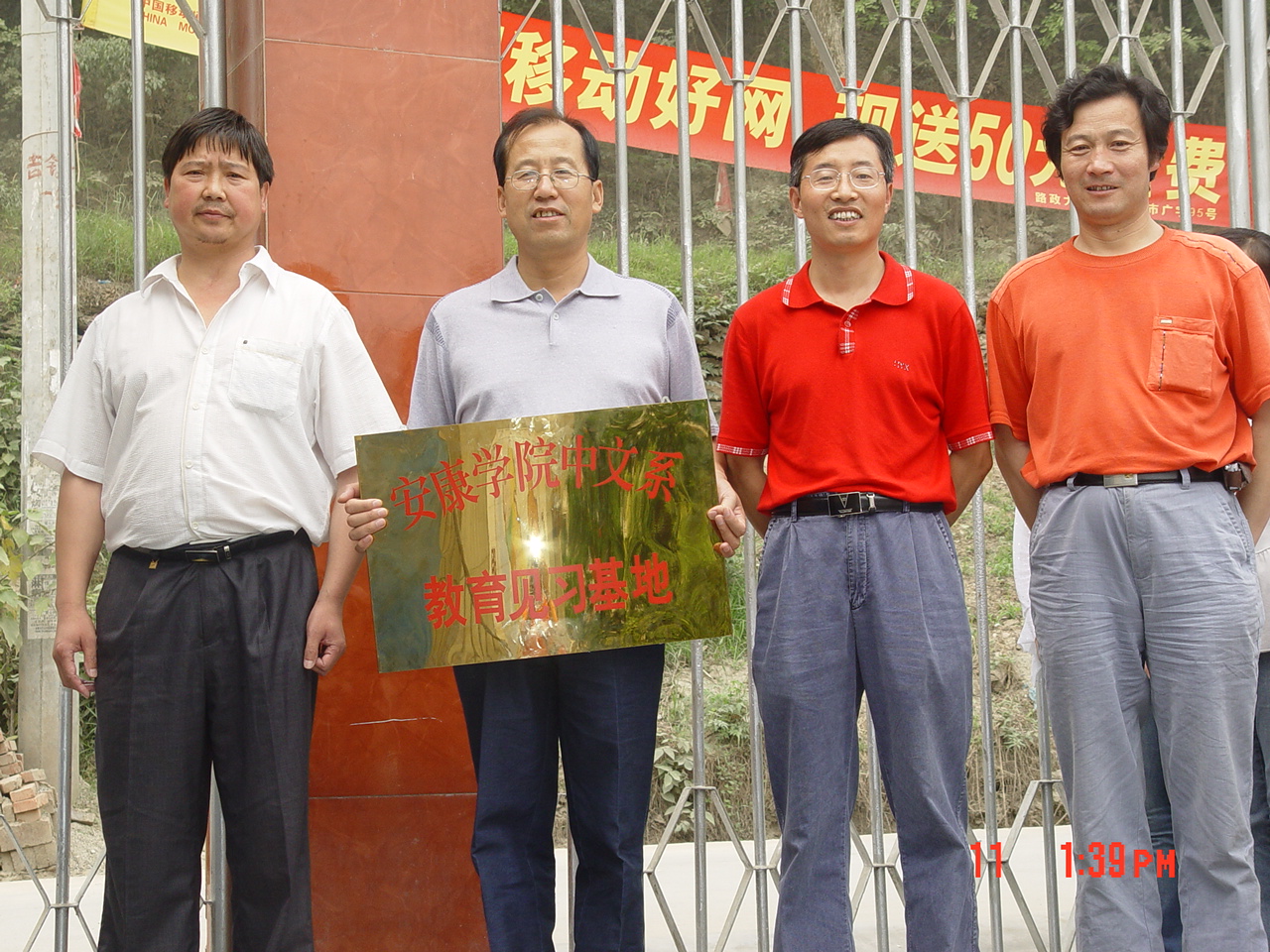 6月11日12:30分学院教务处长罗文谦、中文系党总支书记沈军、副主任雷升录、教学论教师、辅导员及119名学生前往吉河九年制学校见习。一路上,同学们都为能有一次真正接触学生的机会显得兴奋而雀跃。13:20分时由教务处长、中文系书记及吉河中学的校长举行了简短而隆重的“中文系教育教学见习基地”挂牌仪式,中文系119名学生代表见证了这一激动人心的时刻。