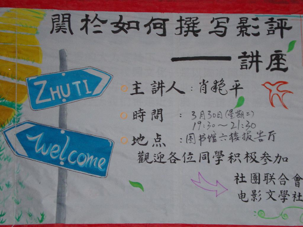 2010年3月30日晚19点30分,中文系青年教师肖艳平应电影文学社邀请在图书馆六楼报告厅做了一场关于“如何提高影评写作能力”的专题讲座,肖老师以她和蔼可亲的态度和平实又不乏幽默的语言为同学们阐述了自己对影视文学的独特见解,其标新立异的观点和生动诙谐的讲课方式让广大影视文学爱好者从思想上对影视文学有了一个全新的认识。