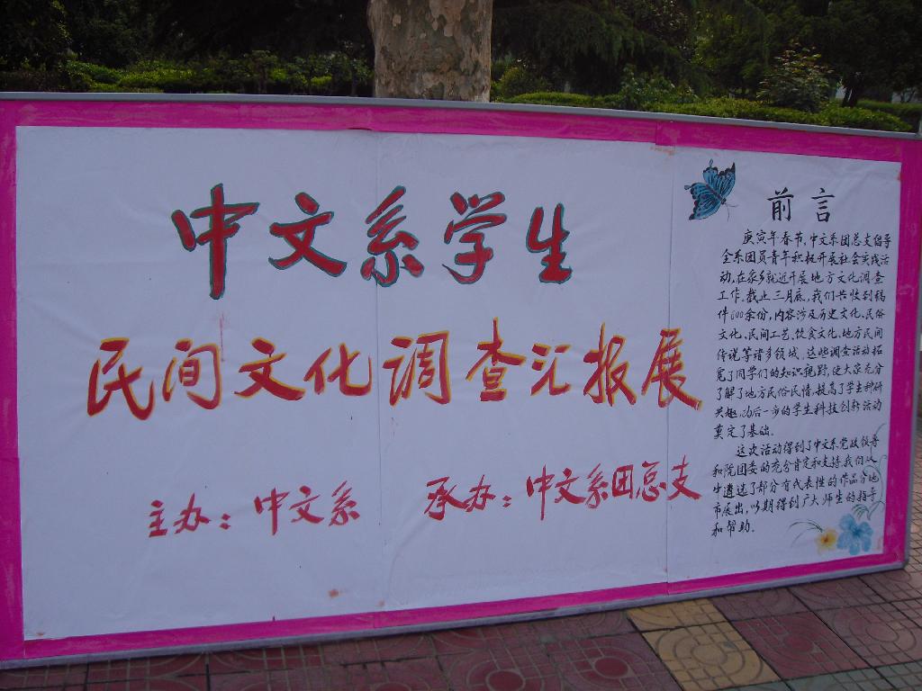为了增强学生对各地民俗、文化的了解,加强爱国主义教育,同时也为了拓宽学生的知识视野、培养学生的科研兴趣、提高学生的科研能力,在春节前夕,中文系团总支倡导、组织全系学生利用春节就近在家乡进行地方文化、民俗调查。学生积极性很高,纷纷深入社区、乡村展开调查,调查的内容涉及地方风俗民情、文物古迹、民间工艺、地方饮食、民间曲艺、民间传说等各个领域。截止三月底共收到调查报告600余份。系领导对同学们的热情和工作给予了高度重视和充分肯定,要求系团总支将优秀稿件展出。在全体团干部的精心筛选下,共选出优秀调查报告176份,于四月十九日在校园展出,引起全院学生广泛关注。这项活动对推动欧冠官网学生科技创新、活跃校园文化生活起到了很好的推动作用。