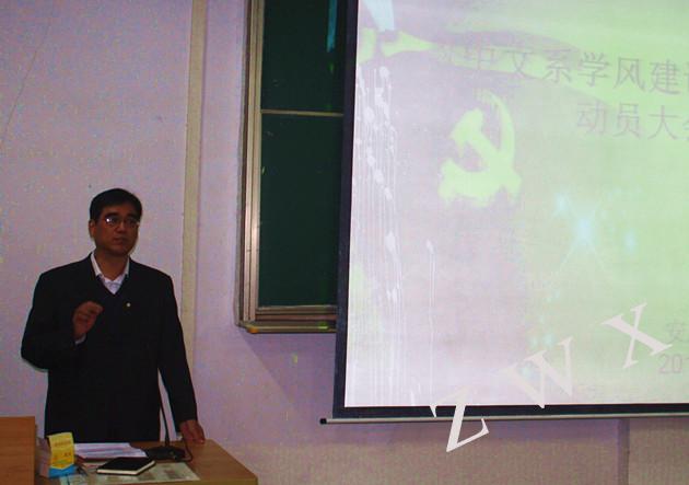 2014年10月26日晚,中文系在1510教室召开“学风建设示范岗”动员大会。中文系党总支书记李岩、学生党支部书记郝礼军、全系入党积极分子、发展对象、学生党员130余人参加了动员会。会议由学生党支部书记郝礼军主持。