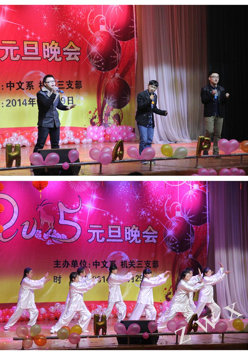 晚会在热闹、欢快的陕北民间歌舞中拉开帷幕。接着,优雅的华尔兹舞蹈、欢快的健美操、曼妙的古典舞蹈、劲爆的街舞轮滑、啦啦操次第登场。机关三支部余婕老师的一曲《知音》,引起观众对爱情的无限遐思;影视戏剧社的小品《退房》,再现了奋进的欧冠联赛官网人浓浓的师生情;留学生倪士杰的新年祝福,表达了喀麦隆学生对中国的无限情怀;第五龙龙等人的诗歌朗诵《我的南方和北方》,激起了大家对伟大祖国的深深眷恋;“太极与双节棍”动与静的美妙组合,更是展示了中华武术的博大精深;史超凡、赵莎的英文歌舞,劲爆火辣;梁启超组合的自编歌曲,激情飞扬。整台晚会,高潮迭起,掌声、笑声、欢呼声不断,突出了“热闹祥和、青春激扬”的主题。