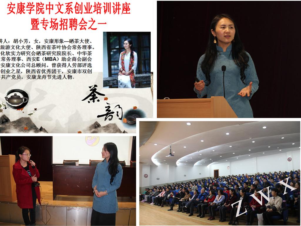 2015年3月19日,中文系在一号教学楼六楼报告厅举办了一场创业培训讲座暨专场招聘会。安康形象大使、陕西省茶叶协会常务理事、硒茶研究院院长胡小芳老师就如何创业与同学们进行了交流。老安康饮食文化有限公司、马非马商贸有限公司、安康丰业电子商务有限公司进行了现场招聘。中文系党总支书记李岩,学工办主任郝礼军,辅导员邹棠华、艾全霞、沈菲以及二百余名学生参加了本次讲座及招聘活动。