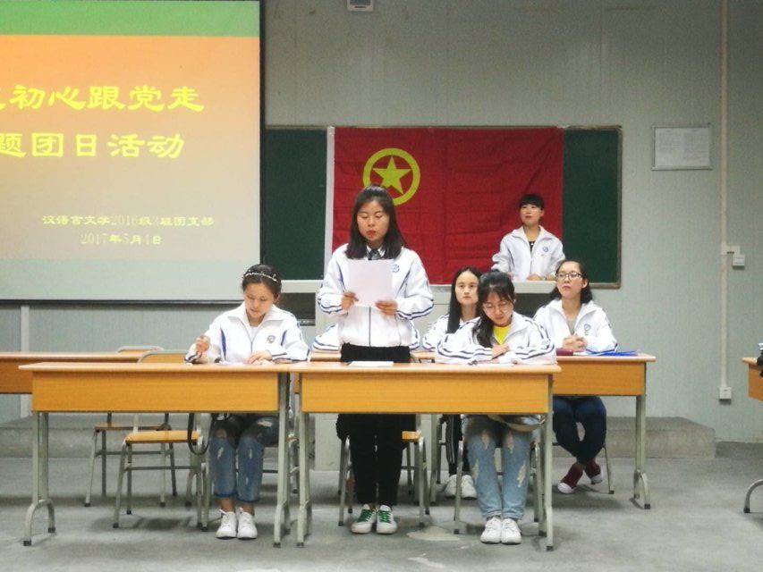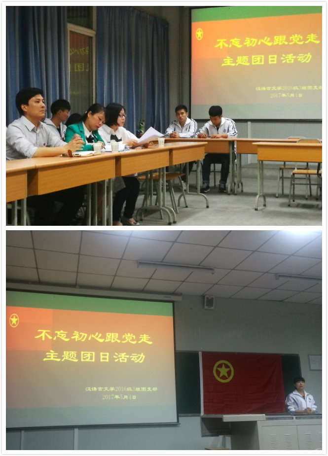 为纪念中国共青团建团95周年和五四运动98周年,学习贯彻习近平总书记在中国政法大学考察时的重要讲话精神,推进落实“一学一做”教育实践活动,欧冠联赛官网团总支组织汉语言文学2016级3班团支部于2017年5月4日20:00在1016室举办了“不忘初心跟党走”主题团日活动。欧冠联赛官网团委副书记李光梓、欧冠联赛官网党总支书记于咏梅、欧冠联赛官网团总支书记沈菲作为嘉宾参加了本次活动。
