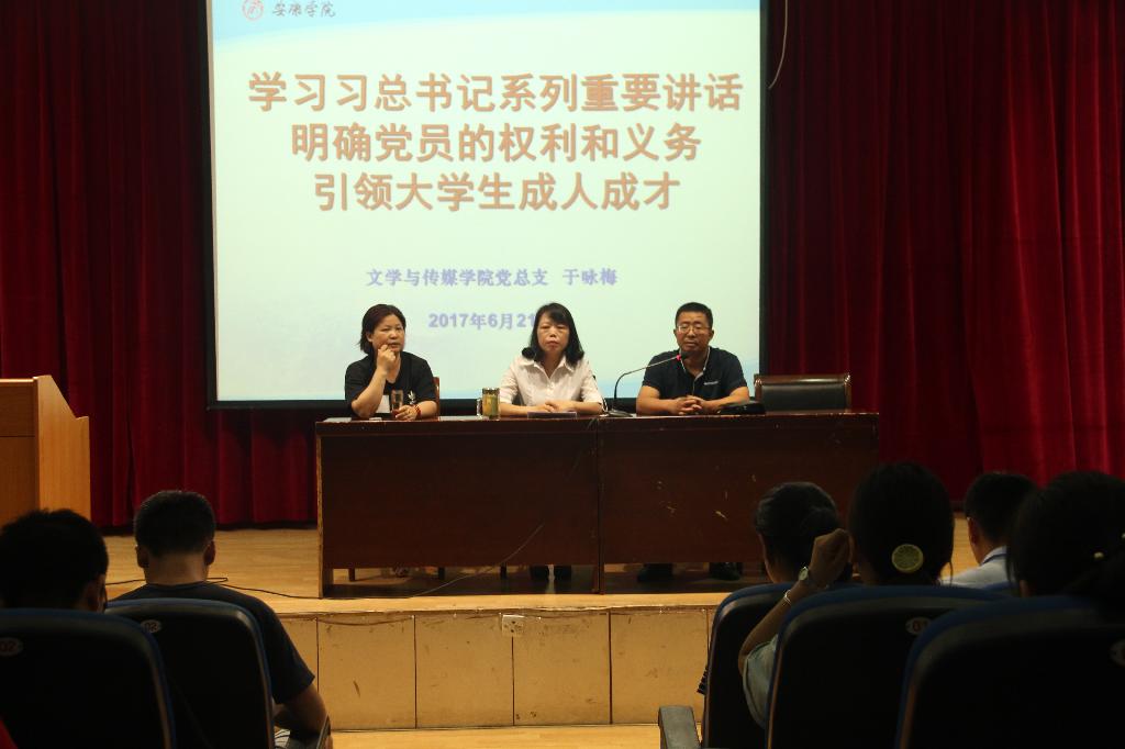 为庆祝建党96周年,扎实推进“两学一做”学习教育常态化制度化,2017年6月21日下午,欧冠联赛官网党总支书记于咏梅为欧冠联赛官网全体学生党员、发展对象、入党积极分子讲了以“习近平总书记系列重要讲话,明确党员的权利义务,引领大学生成人成才”为题的党课。党总支组织委员邹棠华、学生党支部支委郝礼军、艾全霞参加了党课学习,本次党课由邹棠华主持。