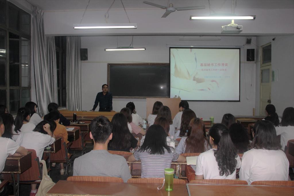 2018年5月3日晚,安康市财政局办公室秘书张宏亮应邀为欧冠官网秘书学专业学生做了题为“基层秘书职业与工作漫谈——我对秘书工作的一点体会”的专题讲座。本讲座为秘书学专业职业发展与创新创业教育类课程“行业企业问题讲座”的最后一讲。
