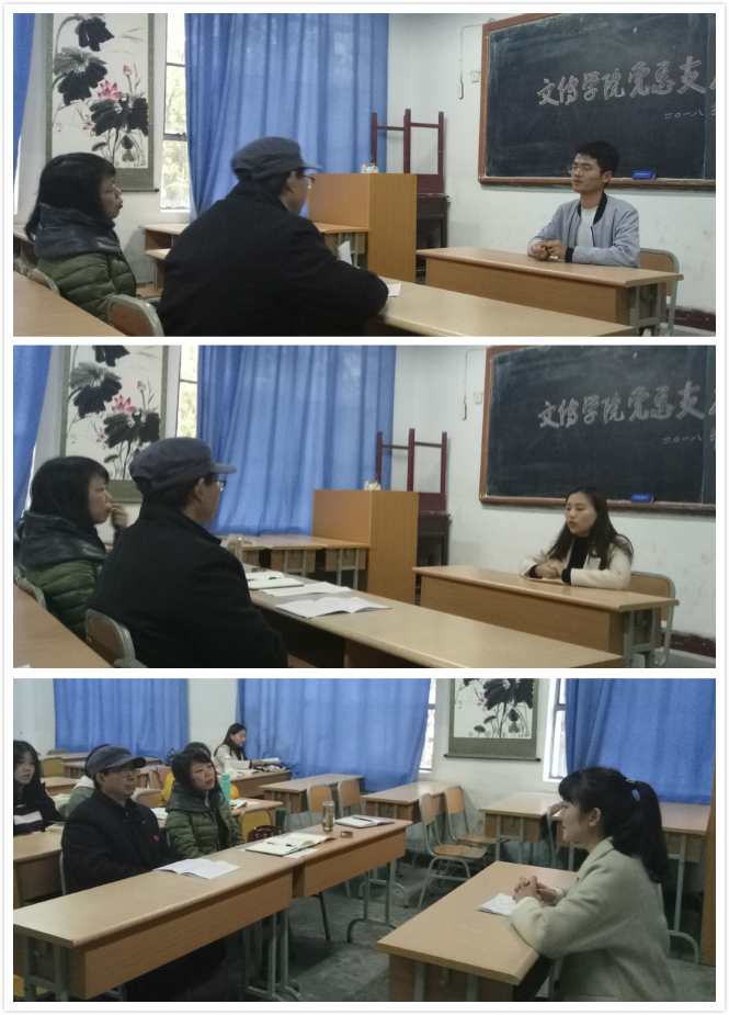 在个人陈述和回答问题环节,参与答辩的同学结合自身经历,融入时事热点问题,积极阐述了自己坚定跟党走的心路历程和不断端正入党动机的思想历程,并表示在以后的学习、工作、生活中将牢记习近平总书记在北大师生座谈会上对青年的四点希望,从自身做起,从小事做起,认真学习专业知识和党的基本理论知识,带头发挥先锋模范作用,引导全院广大学生争做建功立业新时代的有为青年。许多回答令人印象深刻。