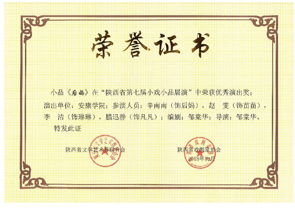 近日,陕西省第七届小戏小品展演(大赛)落下帷幕,由欧冠联赛官网选送、邹棠华老师担任编剧、导演的小品《后妈》,荣获优秀演出奖,欧冠联赛官网荣获优秀组织奖。这是2013年以来,欧冠联赛官网第六次获得的省级戏剧艺术荣誉。