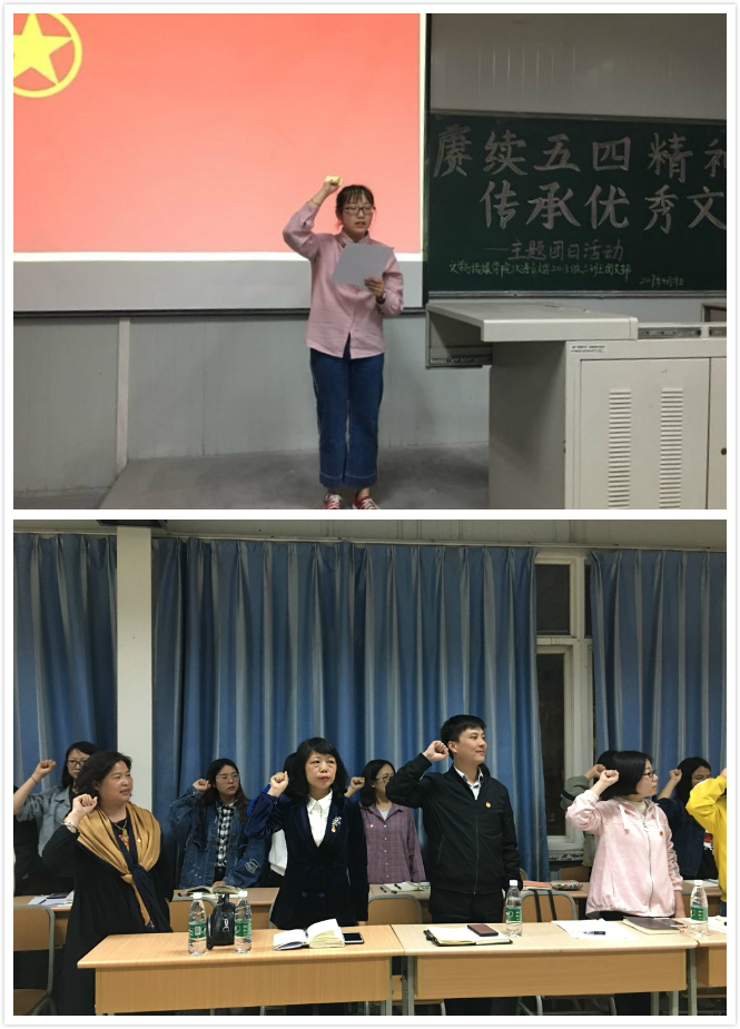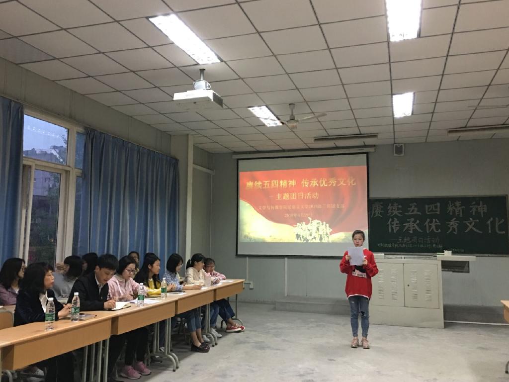 为纪念五四运动100周年,深入学习习近平总书记在中共中央政治局第十四次集体会议讲话精神,加强对五四运动和五四精神的学习理解,4月29日晚上七点半,欧冠联赛官网2018级汉语言文学专业3班在1024教室开展了“赓续五四精神,传承优秀文化”主题团日活动,欧冠联赛官网团委书记李光梓,欧冠联赛官网党总支书记于咏梅,团总支书记、学工办主任沈菲,欧冠联赛官网辅导员艾全霞,以及汉语言文学2018级3班全体同学参加了本次活动。