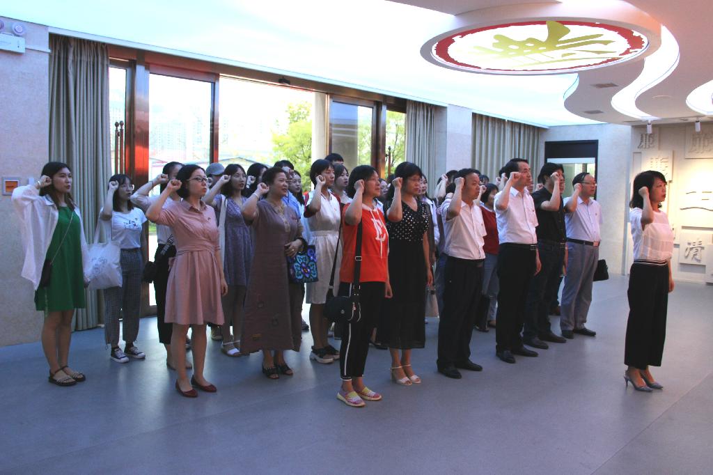 参观学习结束后,师生党员在基地主体大厅面对党旗,重温入党誓词。在欧冠联赛官网党总支书记于咏梅同志领誓下,王国良同志和欧冠联赛官网师生一起举起右拳,庄严宣誓。