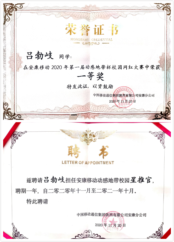 经过近2个月的精彩角逐,“青春心向党 建功新时代”安康移动“动感地带”杯校园抖音网红大赛圆满落下帷幕,欧冠联赛官网网络与新媒体专业2017级吕勃岐同学的作品《这就是安康》荣获一等奖,并被聘请担任安康移动动感地带校园星推官。