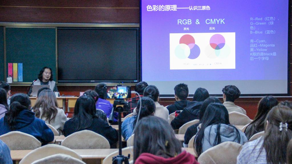 王关棣首先由色彩切入色彩,用小实验和同学们进行互动,通过光的变化展现色彩的变幻,让同学们都感受色彩的奇妙。接着用《点亮》、《你划亮火柴》、《阳光普照》和《日食下的大地》四个短片来阐述色彩的来历和原理。结合日常生活中的色彩,展示季节中色彩的多变,色彩与人的情绪与音乐与环境密切相关,美妙的色彩在影视绘画中展示更加丰富的美感,通过欣赏色彩、感受色彩,提升审美情趣。