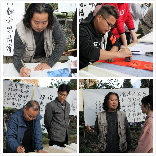 恰逢学校感恩活动月,讲座结束后,师生移步学校2号楼前林荫道,执笔墨共话感恩之情。王关棣先生现场泼墨,勾画感恩画作,并现场指导学生书写的作品,热烈的氛围,为这寒冬染上了一抹暖色。正所谓,笔墨恩情暖,诗文气象新!