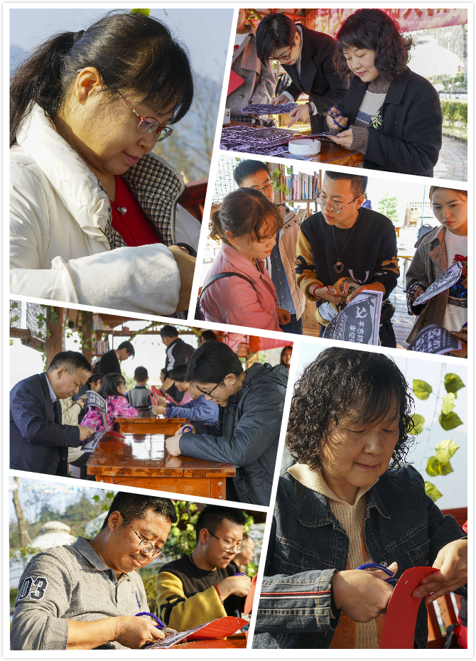 在蒋家坪,教职工们登上山顶,参观了茶园,了解了茶叶产业发展对推动农民增收和乡村振兴的重要作用;在马盘山上,教职工们围坐一起,欧冠官网有剪纸艺术特长学生梁少华一边介绍中华优秀传统剪纸艺术,一边指导老师们用剪刀在红色的纸张上剪出了“坚决跟党走”“不忘初心、牢记使命”等栩栩如生的作品,师生共同沉浸在剪纸艺术氛围中,收获了喜悦,凝聚了情感。