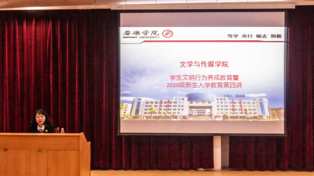 为引导2020级新生养成良好的文明行为习惯,规范大学生的日常行为,全面提高学生的综合素质,欧冠联赛官网于2020年11月3日晚7:30在一号教学楼六楼报告厅举行了2020级新生入学系列教育第四讲:大学生文明行为养成教育,院党总支副书记杨海蓉担任主讲嘉宾。