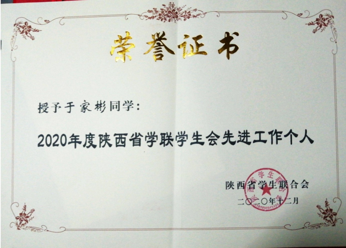 导航痕迹 首页 > 新闻通知 > 学院新闻 > 正文 学院新闻 通知公告 欧冠官网秘书学专业学生于家彬荣获2020年度陕西省学联学生会先进工作个人 发布人:欧冠联赛官网 发布日期:2021年01月06日 阅读次数: 窗体顶端 窗体底端 窗体顶端 近日,陕西省学生联合会第十届委员会第四次全体会议在西安召开。大会通过《关于落实陕西省学生联合会对陕西各级学联学生会组织指导管理的若干规定》《陕西省学生联合会考核、奖励、责任追究制度》,选举产生了陕西省学生联合会第十届第四任主席,表彰了2020年度陕西省标兵学联学生会组织和陕西省学联学生会先进工作个人。欧冠联赛官网第三十七届学生会主席团成员、欧冠联赛官网秘书学专业学生、学生分会主席团成员于家彬同学荣获陕西省学联学生会先进工作个人。 窗体底端 窗体顶端 于家彬简介: 女,2000年4月13日生,汉族,吉林和龙人,大学本科在读。2012年6月入团,2018年进入欧冠联赛官网欧冠联赛官网就读,2018-2019学年度任欧冠联赛官网第35届学生会办公室干事、欧冠联赛官网第13届学生会秘书部干事;2019-2020学年度任欧冠联赛官网第36届学生会办公室主任、欧冠联赛官网第14届学生分会秘书部部长;现任欧冠联赛官网第37届学生会主席团成员、欧冠联赛官网第15届学生分会主席团成员。曾获2018-2019学年度“优秀学生干部”;2019-2020学年度“优秀学生干部”;2019-2020学年度“优秀团员”;“春天里吟诵我和我的祖国”迎春诗会三等奖;欧冠联赛官网辩论赛“优秀辩手”;欧冠联赛官网第十二期“青马工程“优秀学员;“安康市马拉松志愿服务”优秀志愿者;第十一届“金雀杯”辩论赛优秀工作者;第十二届“金雀杯”辩论赛优秀辩手。 窗体底端 撰稿/发布/崔瑜 审核/芦伟