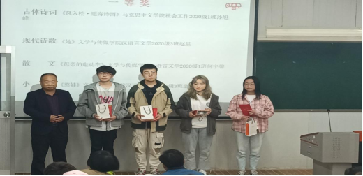 首先,主持人对“风华文创奖”征文大赛的主题、体裁、分设奖项以及投稿数目分别做了简单的介绍并宣读本次获奖名单和作品。特邀嘉宾李波老师、崔德全老师以及指导老师韩文霞分别为获奖同学颁奖并合影留念。