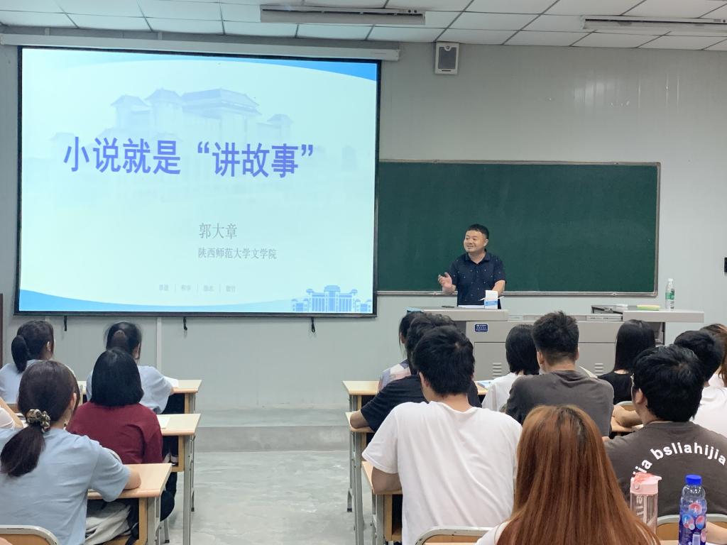 郭大章博士一开始就提出课程讨论主题:小说就是“讲”“故”“事”。他从什么是“讲”故事,怎么“讲”故事,为什么讲“故”事,“事”的真与假等多个角度展开讨论。在讲述过程中,他与学生分享了自己的创作经历,并以自己创作的《银杏银杏》《遍地月光》《门道》三部作品为案例,从创作技巧到阅读效果展开分析。他鼓励学生参与到故事的讲述中,学生积极参与互动,反响强烈。
