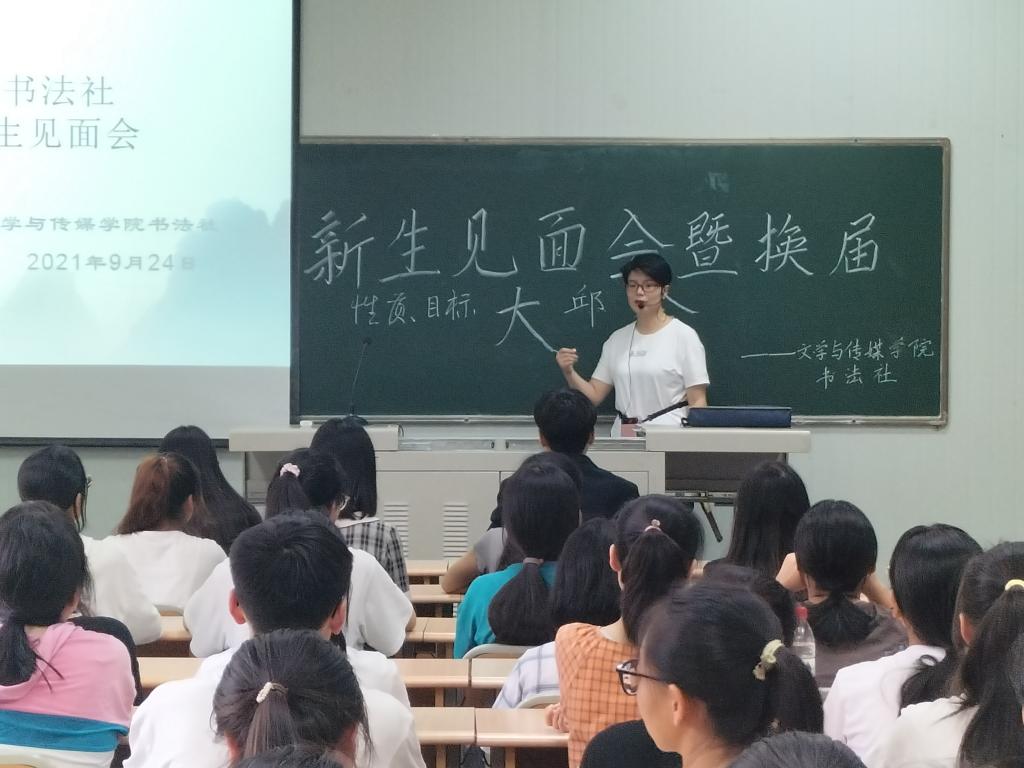 彰显笔墨风采,传承书香文化。欧冠联赛官网书法社于2021年9月24日16:40在1028教室成功举办了第八届换届暨纳新仪式见面会。参加见面会的有书法社指导老师周海霞老师,前任社长王思蓉,现任社长马子涵以及103位社团成员。
