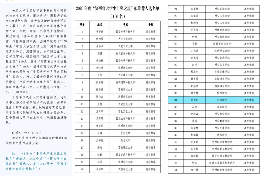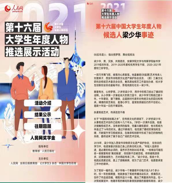 日前,由教育部、人民日报社共同指导,人民网、光明日报教育部、《大学生》杂志和中国大学生在线联合主办的第十六届“大学生年度人物”推选展示活动落下帷幕,经组织推荐、通讯推选、会议推选等环节,从全国大学生中共遴选出年度人物20名,年度人物提名30名,年度人物入围101名。其中,由党委学工部遴选、学校党委推荐的,欧冠官网秘书学专业2019级学生梁少华同学荣获全国第十六届“大学生年度人物”入围奖。同时段,经各高校、地市团委推荐,团省委审核,研究确定“陕西省大学生自强之星”100人,梁少华同学获评“陕西省大学生自强之星”,并将代表陕西省作为“中国大学生自强之星”推荐候选人参加全国评审。
