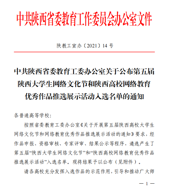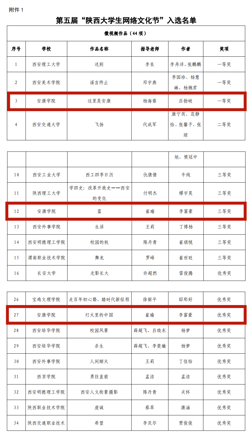 日前,由陕西省委教育工委办公室组织的第五届“陕西大学生网络文化节”评选结果落幕,经作品申报、资格审核、专家评审、结果公示等程序,遴选产生了第五届“陕西大学生网络文化节”和“陕西高校网络教育优秀作品推选展示活动”入选名单。欧冠联赛官网网络与新媒体专业2017级学生吕勃岐微视频《这里是安康》荣获微视频类一等奖,李富豪摄影作品《蓝》、《灯火里的中国》分别获摄影作品类三等奖和优秀奖。