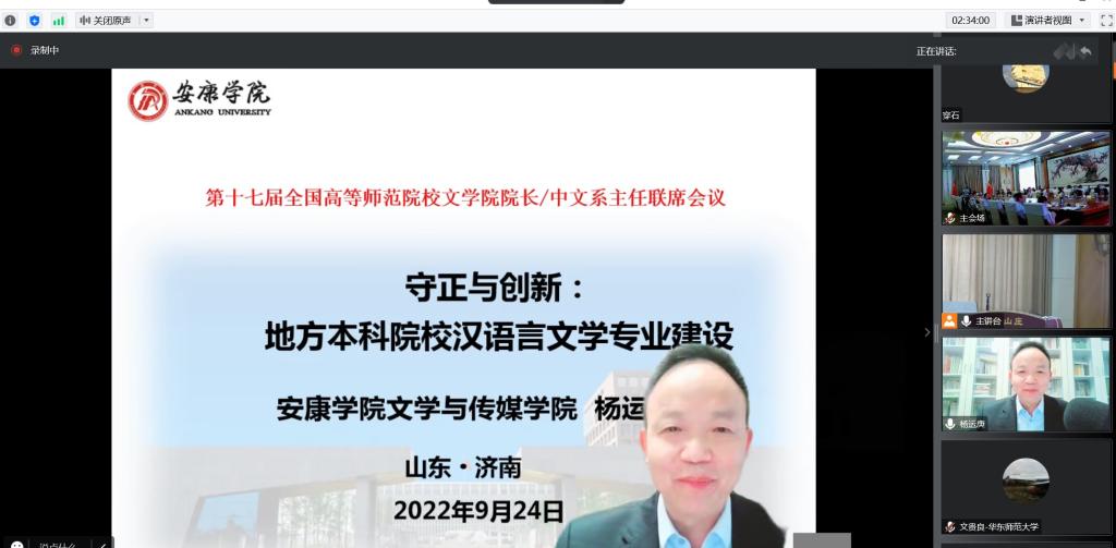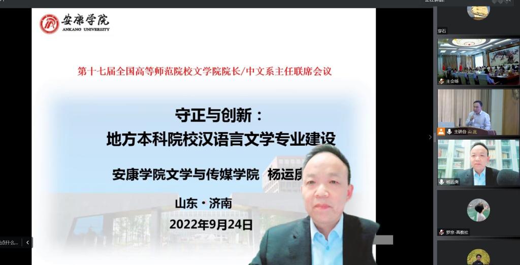 9月24-25日,由教育部中国语言文学类专业教学指导委员会指导,由高等师范院校中文专业联盟理事会、高等教育出版社、山东师范大学联合主办的第十七届全国高等师范院校文学院院长/中文系主任联席会议在山东师范大学召开,会议通过线上线下结合的方式举行,全国80余所师范院校的150余名文学院院长、中文系主任参加了会议。欧冠官网院长杨运庚教授以线上的方式参加了会议并做了大会报告。
