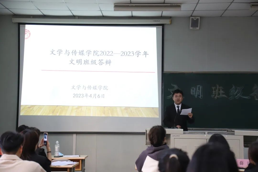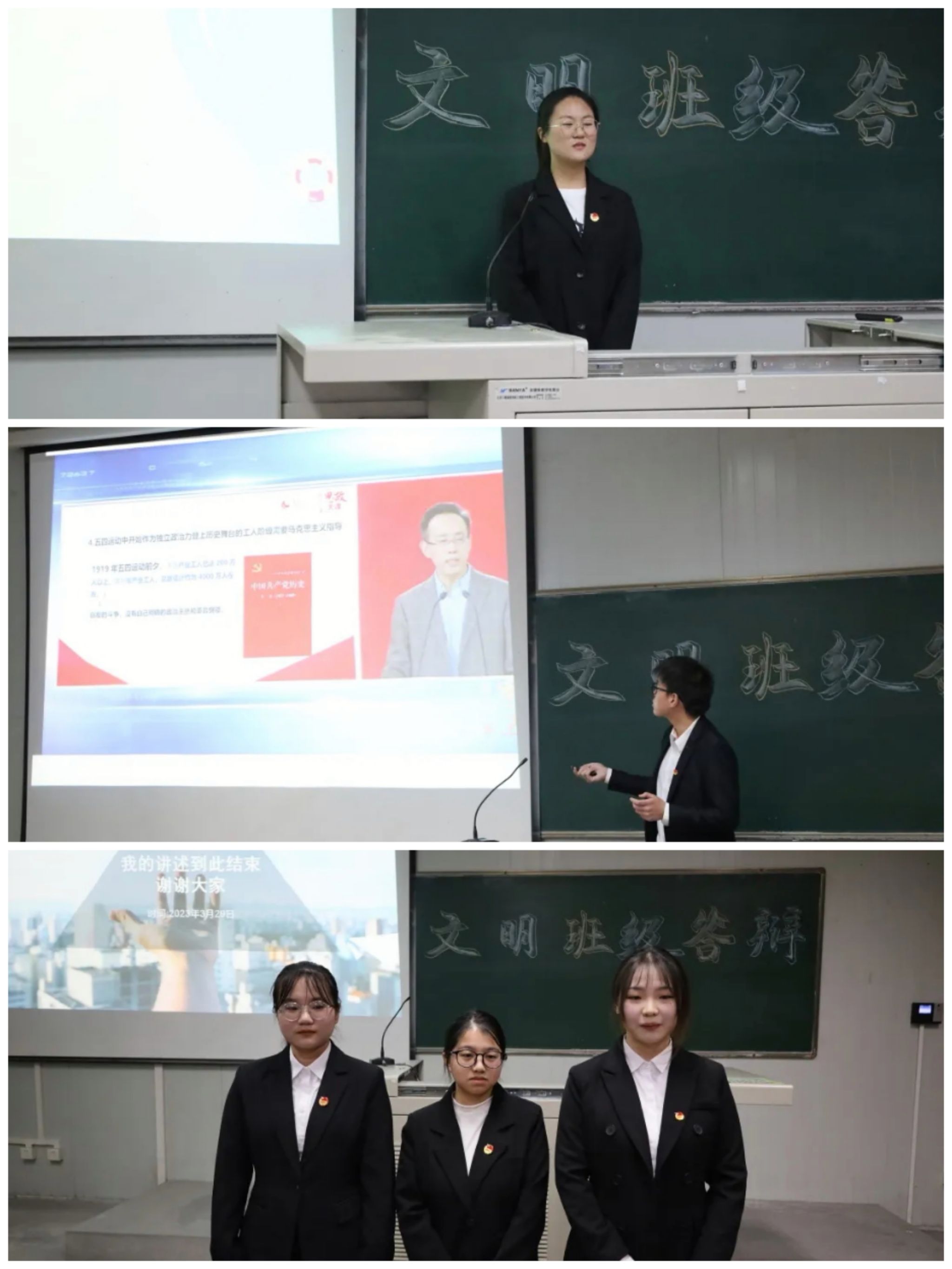 为推进欧冠官网学风、班风建设,规范班级管理,增强班级凝聚力、向心力和创造力,充分发挥文明班级的示范引领作用,欧冠联赛官网于2023年4月6日18:30在1024教室举办2022—2023学年文明班级答辩活动。院党总支副书记杨海蓉、学工办副主任薛涛、团总支书记彭潇和辅导员李欣逸老师担任评委,欧冠官网2020—2022级的各班学生代表参与此次答辩。活动由2022级王文康同学主持。