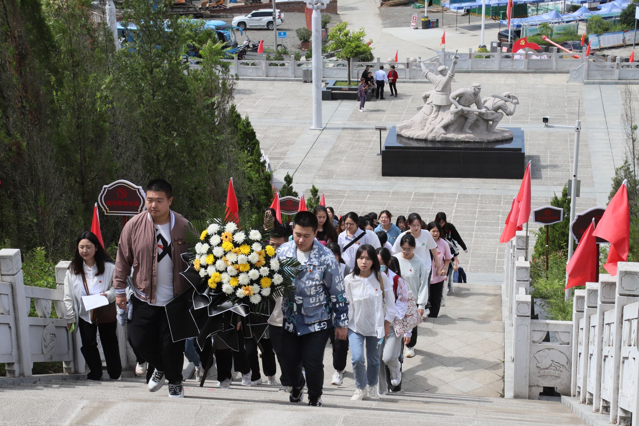 到达牛蹄岭后,团员们共同瞻仰牛蹄岭战斗纪念碑,全体肃立,向烈士默哀,为他们献上花篮,缅怀先烈的丰功伟绩和崇高精神,表达深切悼念和无限敬仰,并在领词人的带领下全体成员重温入团誓词。接着,讲解员向大家生动讲述了牛蹄岭战役的过程,带领同学们重温战火纷飞、艰苦奋斗的年代,体会革命战争时期的艰苦和革命烈士不屈不挠的精神。最后,全体成员前往革命纪念广场进行了文艺汇演。